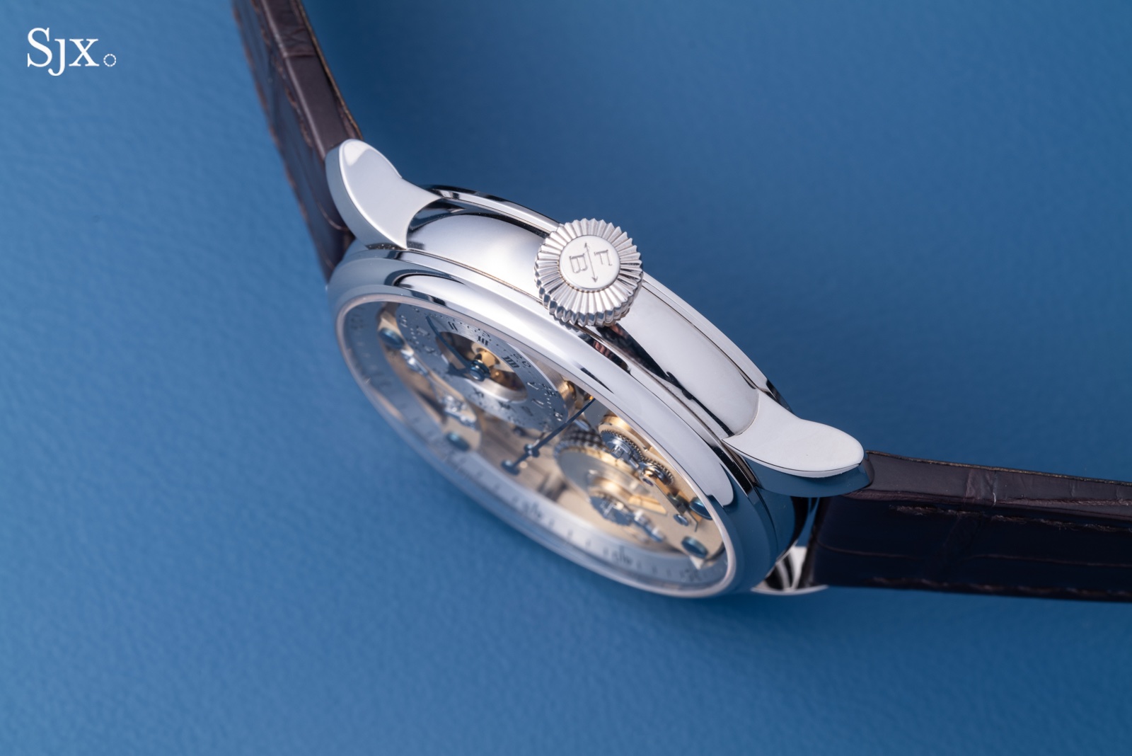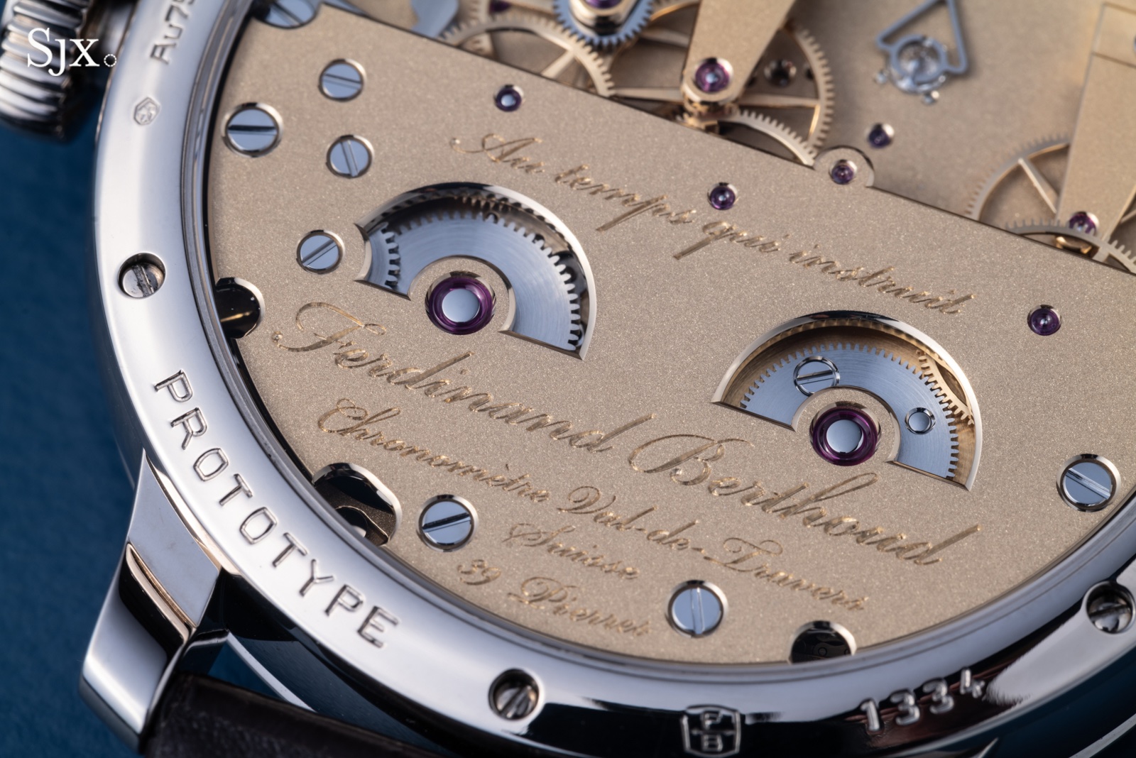 Both the main dial and the flange for the seconds are made of solid white gold and free-hand engraved and lacquered. The movement is also engraved with flowing script that translates as, “Dedicated to time, the great teacher.” This is said to be a maxim of Louis Berthoud, Ferdinand’s nephew who took over the business after his death and who was a renowned watchmaker in his own right. For a watch that takes so much time to make, this inscription is fitting.