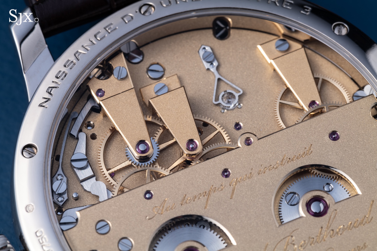 One of the complicated things about this setup is that, unlike ordinary mainspring barrels that are wound in the same direction that they unwind, the chain and fusée must rotate backward during winding, requiring additional complexity to keep the movement ticking while the watch is wound. In the case of the Montre 3, this takes the form of an auxiliary spring with about 30 minutes of power reserve that sits compactly within the fusée cone.