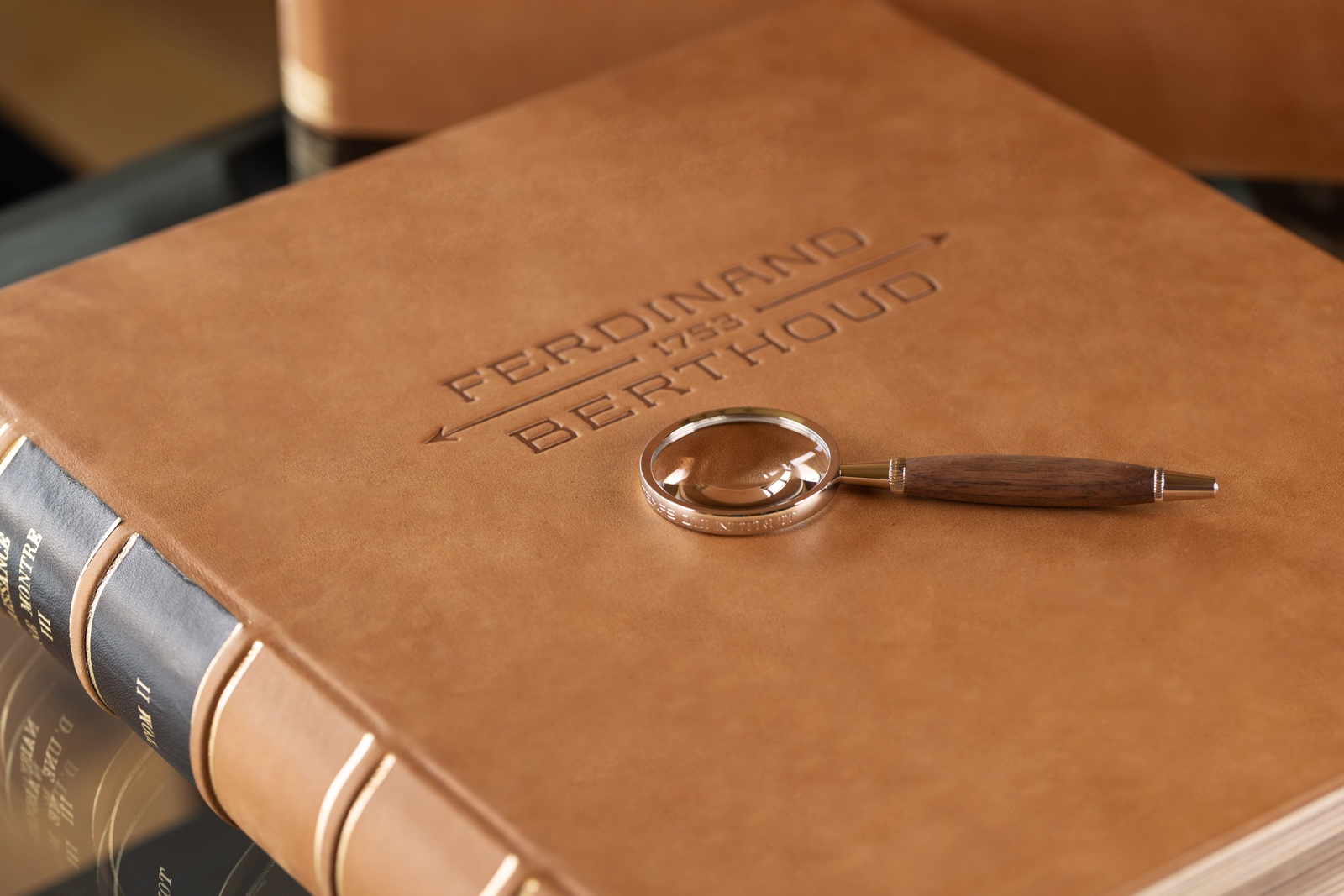 There are actually two boxes, each designed to look like an old book, inspired by the volumes published by Berthoud in his time. The boxes are made of wood, covered in leather, and embossed. The first houses the watch, and the second contains the supporting documentation including a USB stick with the full details of production.