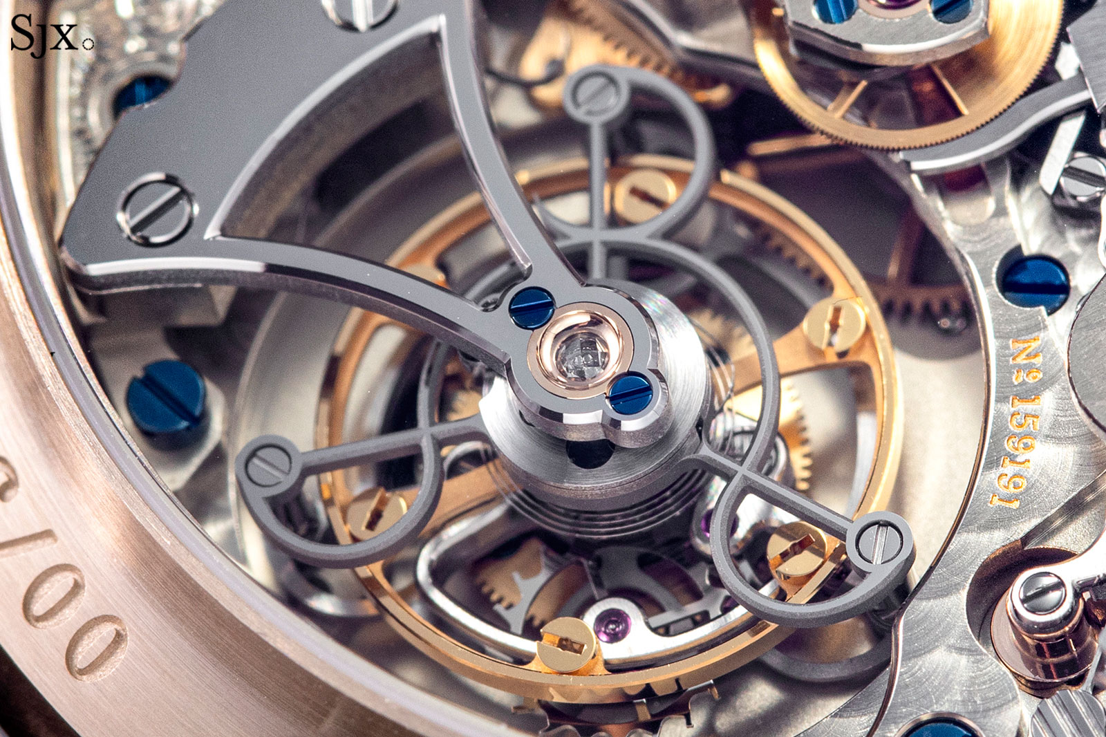 The inverted form and functionality also departs from traditional usage of diamond end-stones; brands like A. Lange & Söhne often use them to embellish their tourbillon watches, but only on the pivot for the tourbillon cage, not the balance staff itself.