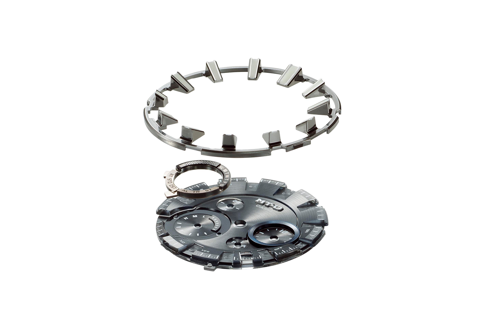 The Loco is a highly sculptural watch, inside and out, with contrasting finishes that make the most of its geometric forms; it would be a tedious process to inventory the numerous straight-grained, beveled, polished, and frosted surfaces found throughout the case, dial, and movement.