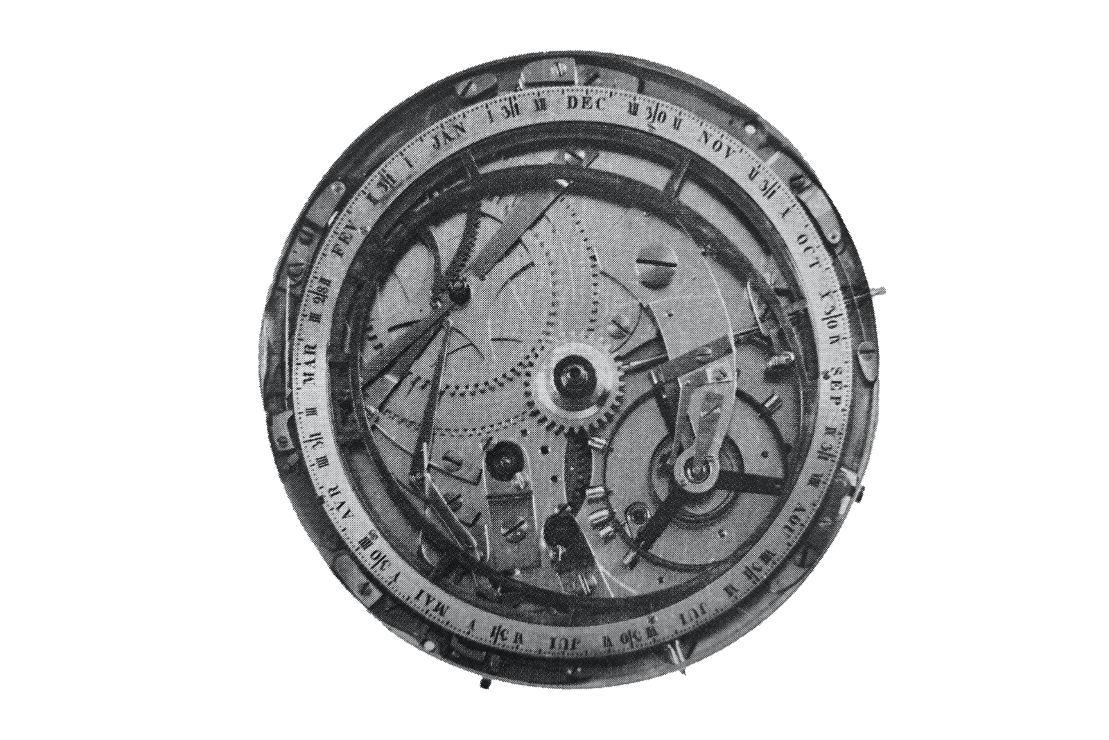 No 4308, movement, dial side, with EOT cam engraved with the months of the year visible on the right @ Watches & Clocks in the Sir David Salomons Collection, George Daniels & Ohannes Markarian.