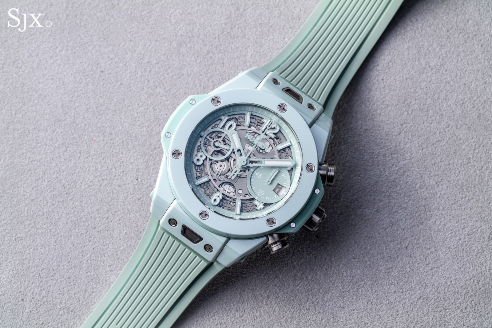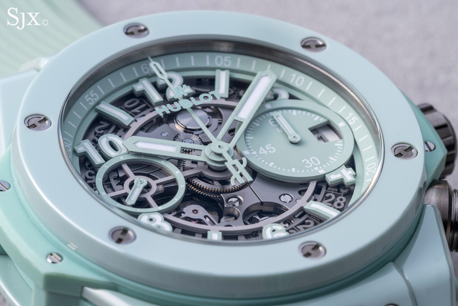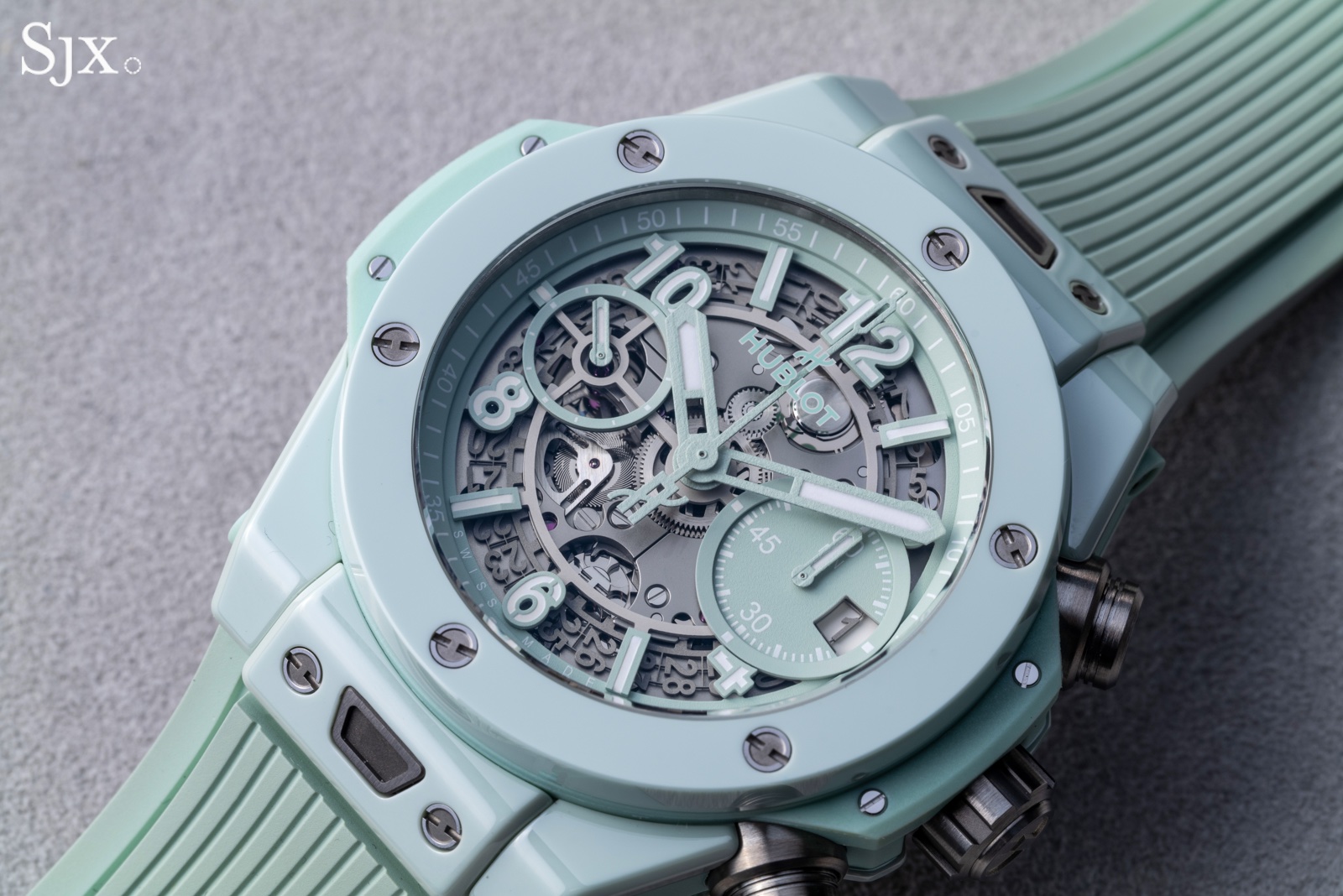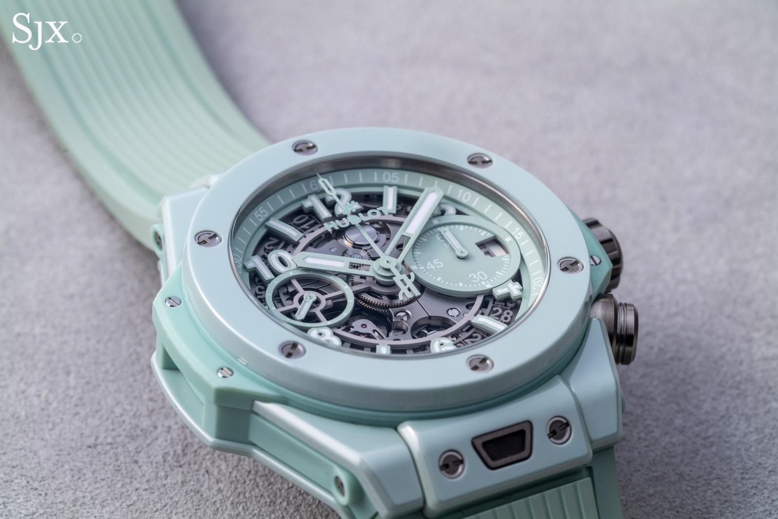 Hublot does not have a great reputation when it comes to value-for-money, but this is mainly because the comparative set often includes brands with more traditional styling like Panerai and IWC that offer a similar level of watchmaking at a lower price point. For example, the Big Bang mint green ceramic retails for US$24,100, which is about US$10,000 more than the IWC “Top Gun” Miramar chronograph in pale blue ceramic, which is a very similar watch on paper.