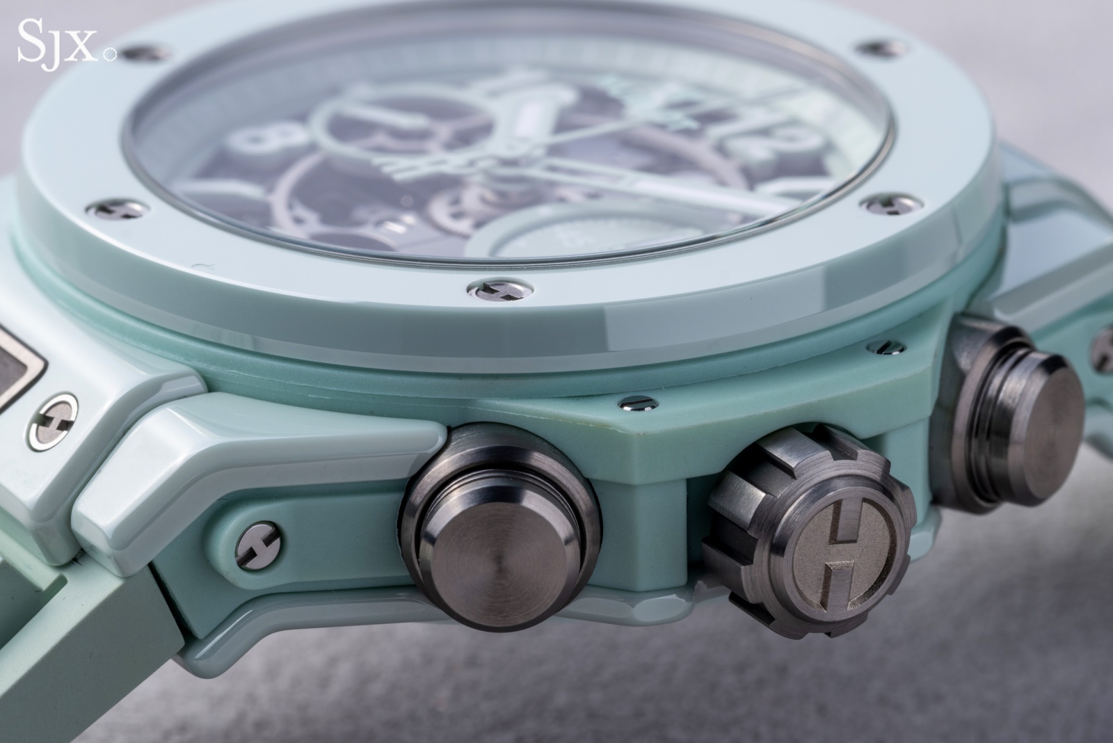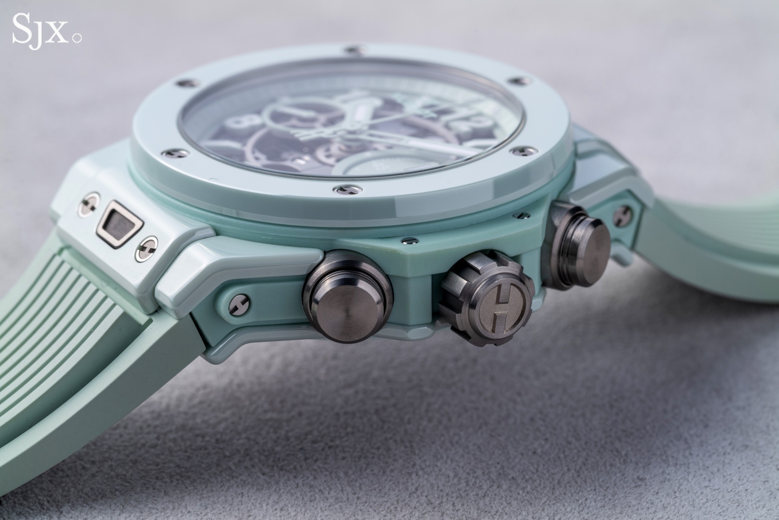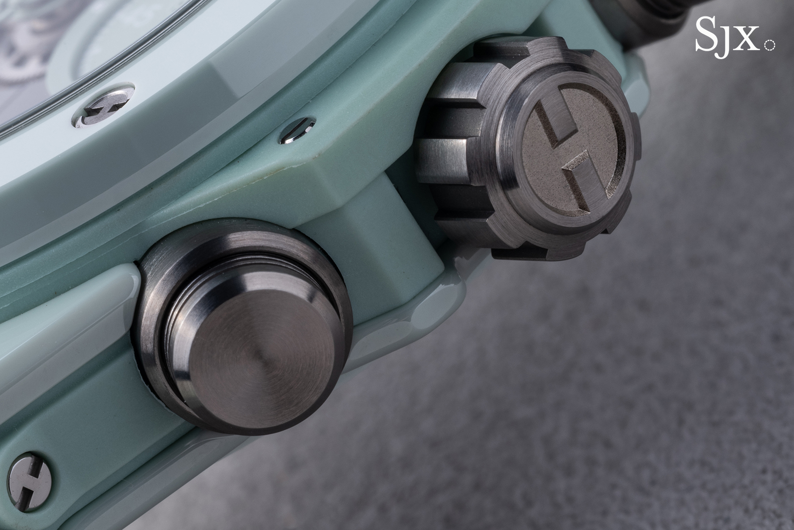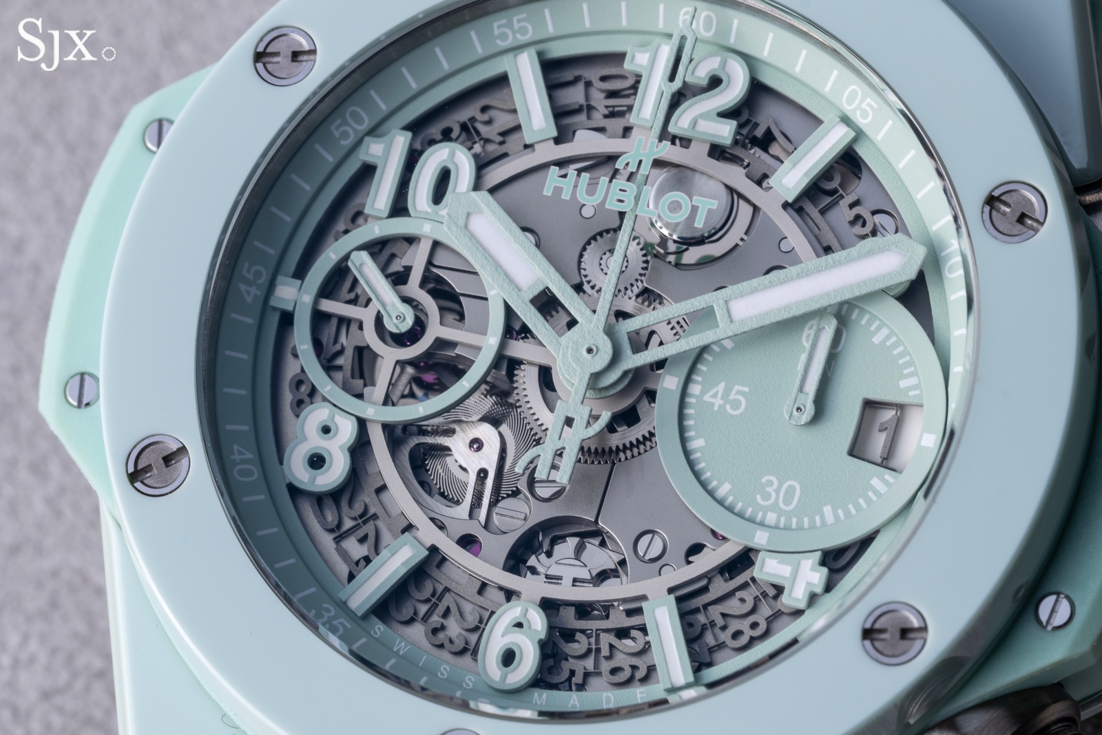 Hublot does not have a great reputation when it comes to value-for-money, but this is mainly because the comparative set often includes brands with more traditional styling like Panerai and IWC that offer a similar level of watchmaking at a lower price point. For example, the Big Bang mint green ceramic retails for US$24,100, which is about US$10,000 more than the IWC “Top Gun” Miramar chronograph in pale blue ceramic, which is a very similar watch on paper.