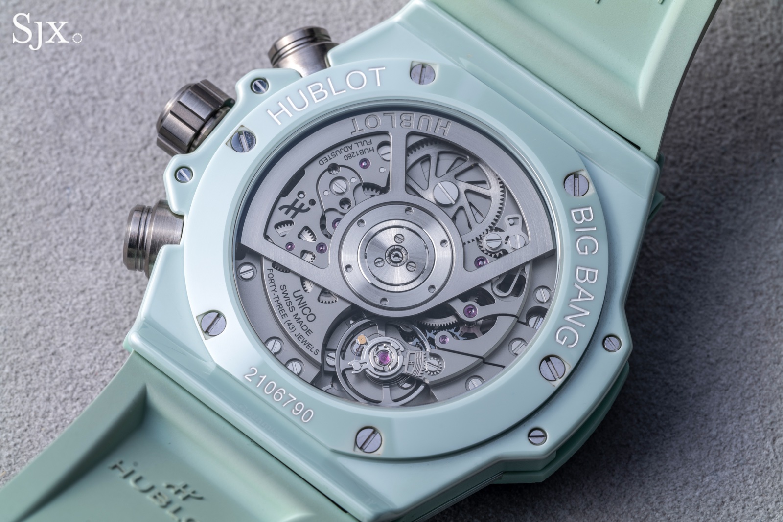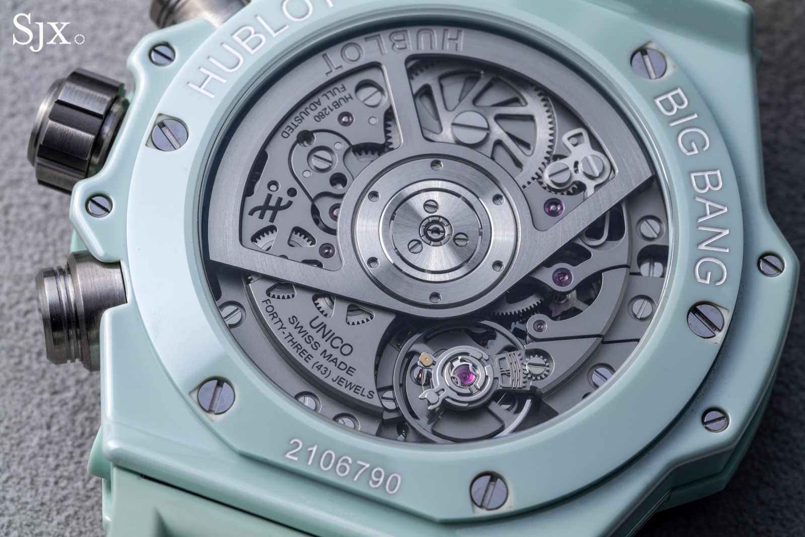 The Big Bang is powered by Hublot’s second-generation Unico flyback chronograph platform, the HUB1280, which is integrated, but with the chronograph works on the dial side. Introduced in 2018, the HUB1280 is uniquely suited to the open-worked design of the Big Bang, featuring a column wheel and horizontal clutch positioned on the dial-side of the movement.