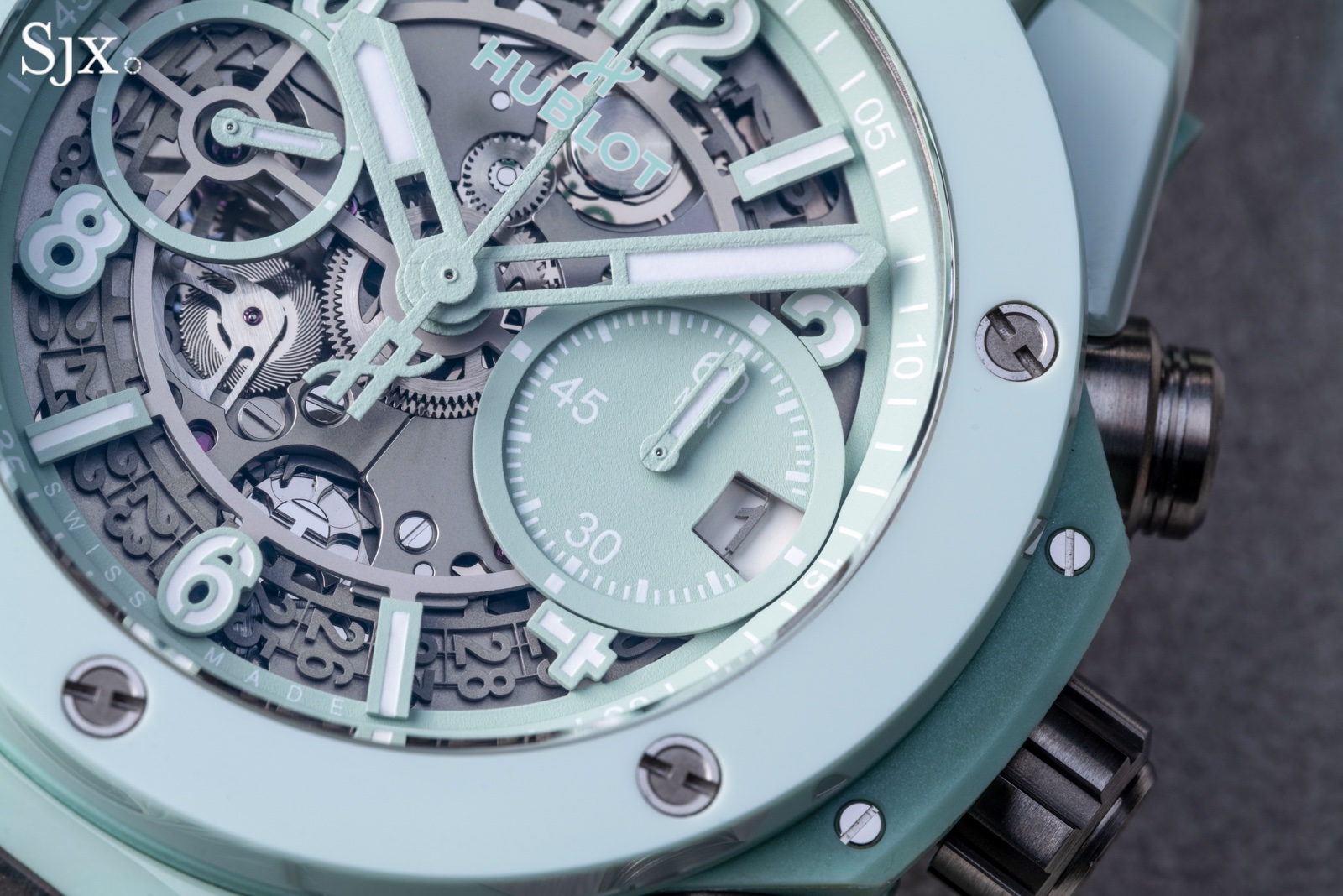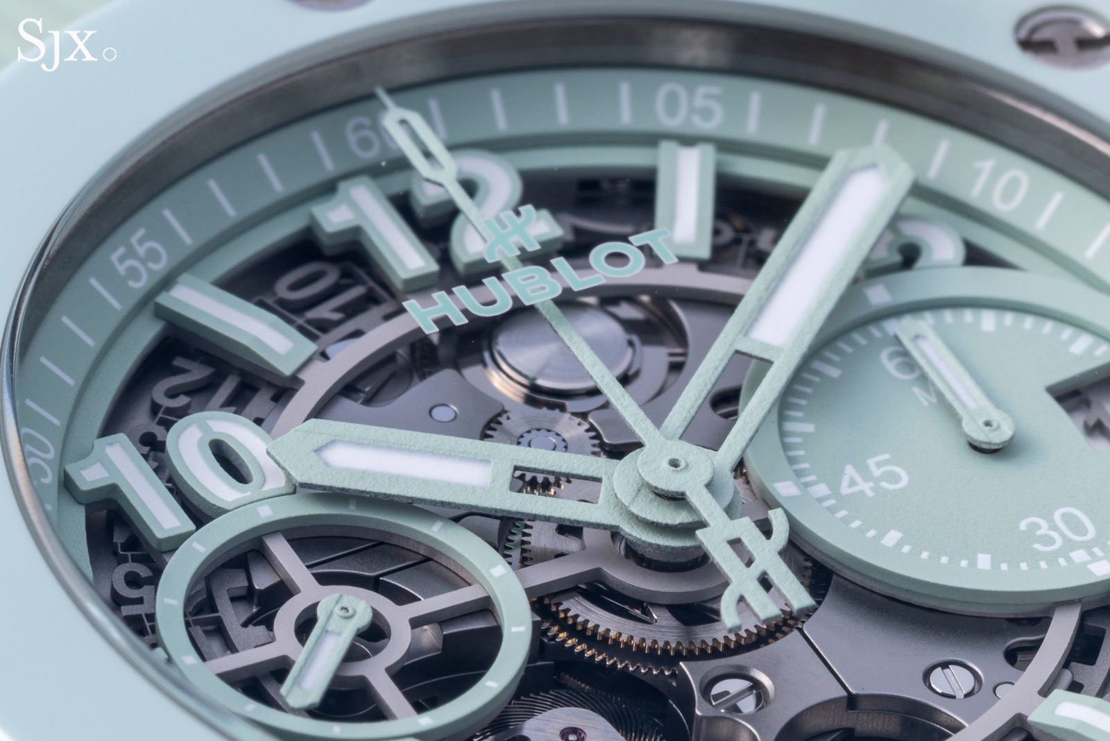 Hublot has managed to overcome these challenges in the past and produced ceramic watches in pale blue, bright orange, and fire engine red. In this case, the pleasing pastel green colour and deep, glossy finish help tone down the intensity inherent to the design of the Big Bang.