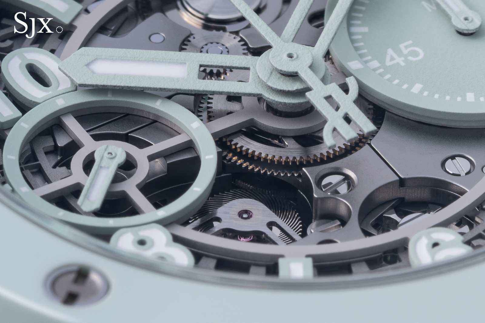 One of the notable features visible near seven o’clock is a wheel comprised of spring-loaded teeth, which is the chronograph coupling wheel. This design reduces backlash and helps mitigate the momentary jitter of the seconds hand that often occurs when starting a chronograph with a horizontal clutch design. Hublot hasn’t shared many details about this, but it is almost certainly fabricated via LIGA; Rolex uses a similar design in the cal. 4131 that powers the Daytona.