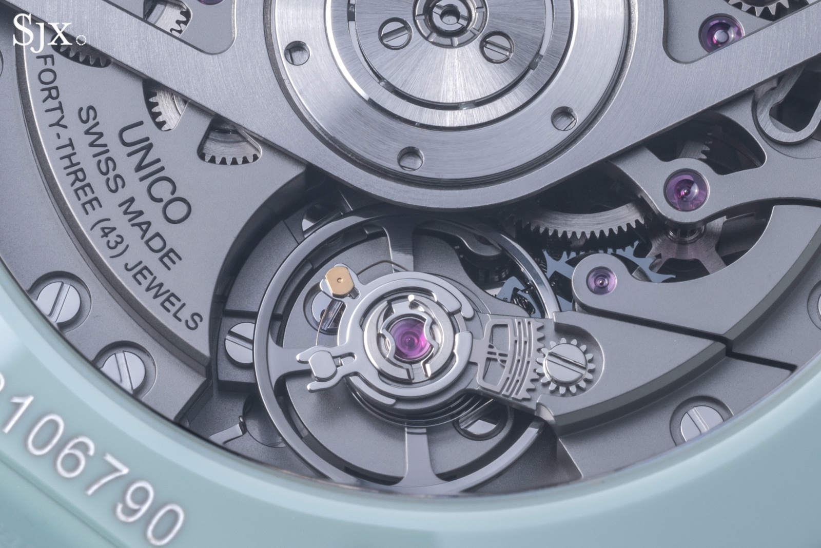 The Unico platform evolved pretty substantially between first and second generations. Not only does the HUB1280 now offer flyback functionality, but the entire movement was slimmed down from about 8 mm to just 6.75 mm; it’s now just a hair thicker than the segment-leading Rolex cal. 4131.