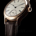 For the black enamel dial of the Chronomètre Contemporain II in platinum, a type of white acrylic paint is used. On the 18k rose gold model, which features a warm, translucent white enamel dial, enamel paint is used for the markings.