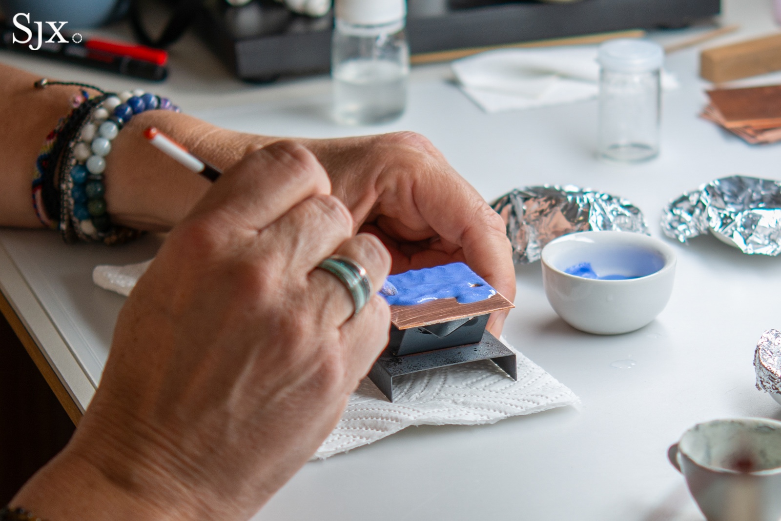 The enamel’s sensitivity to things like temperature and humidity reminds me of winemaking. Like grapes in a vineyard, enamel is capricious and demanding. Like a vintner, the enameller must anticipate the effect that small actions will have on later stages of the process, and the smallest oversight at any point can ruin an otherwise perfect creation.
