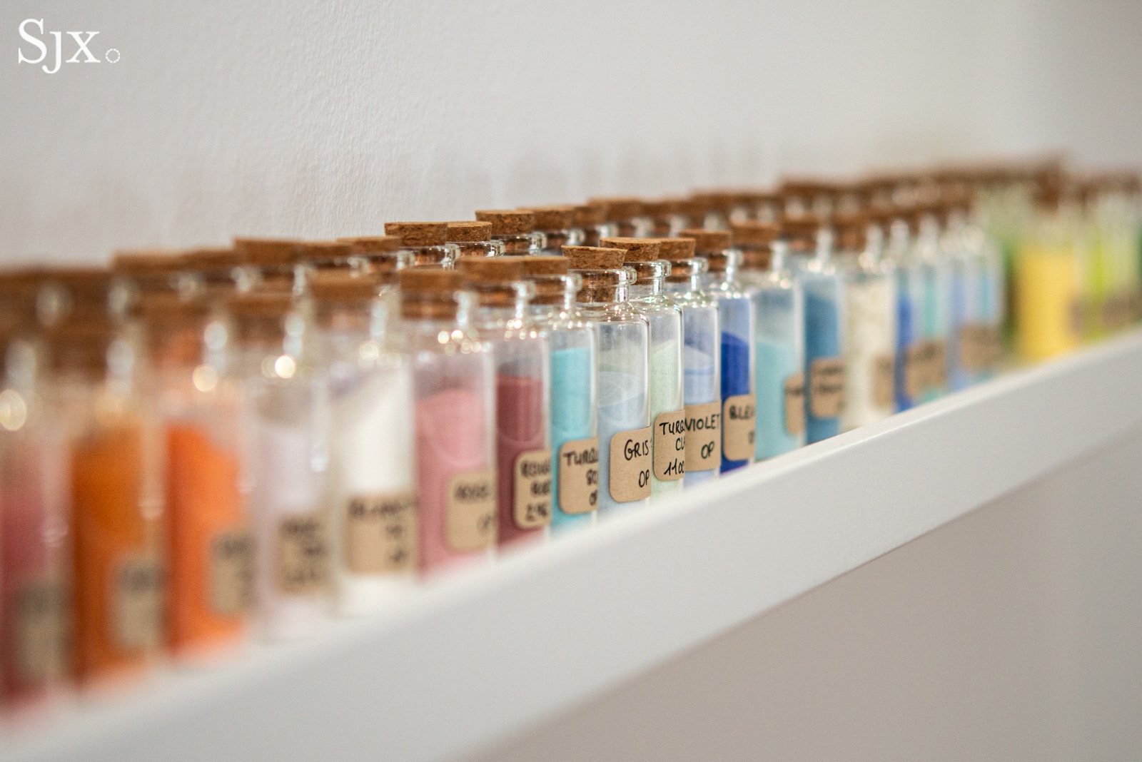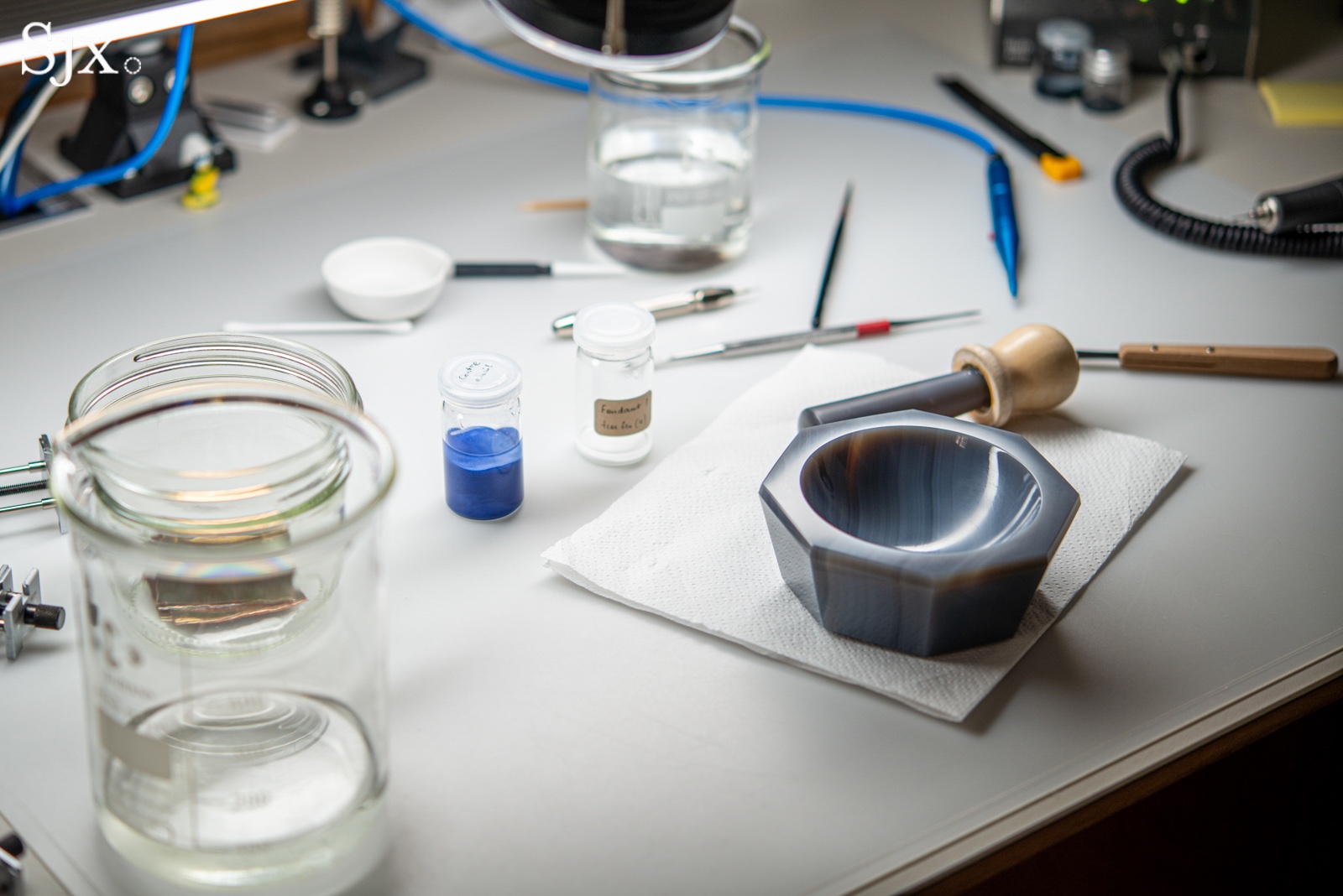 The enameller starts by choosing a colour of enamel frit from a vast assortment kept in inventory. This sounds like it should be the easiest part of the process, but colour selection is actually quite nuanced since the colours often change when they are fired, with the final shade being determined by the specific firing temperature.