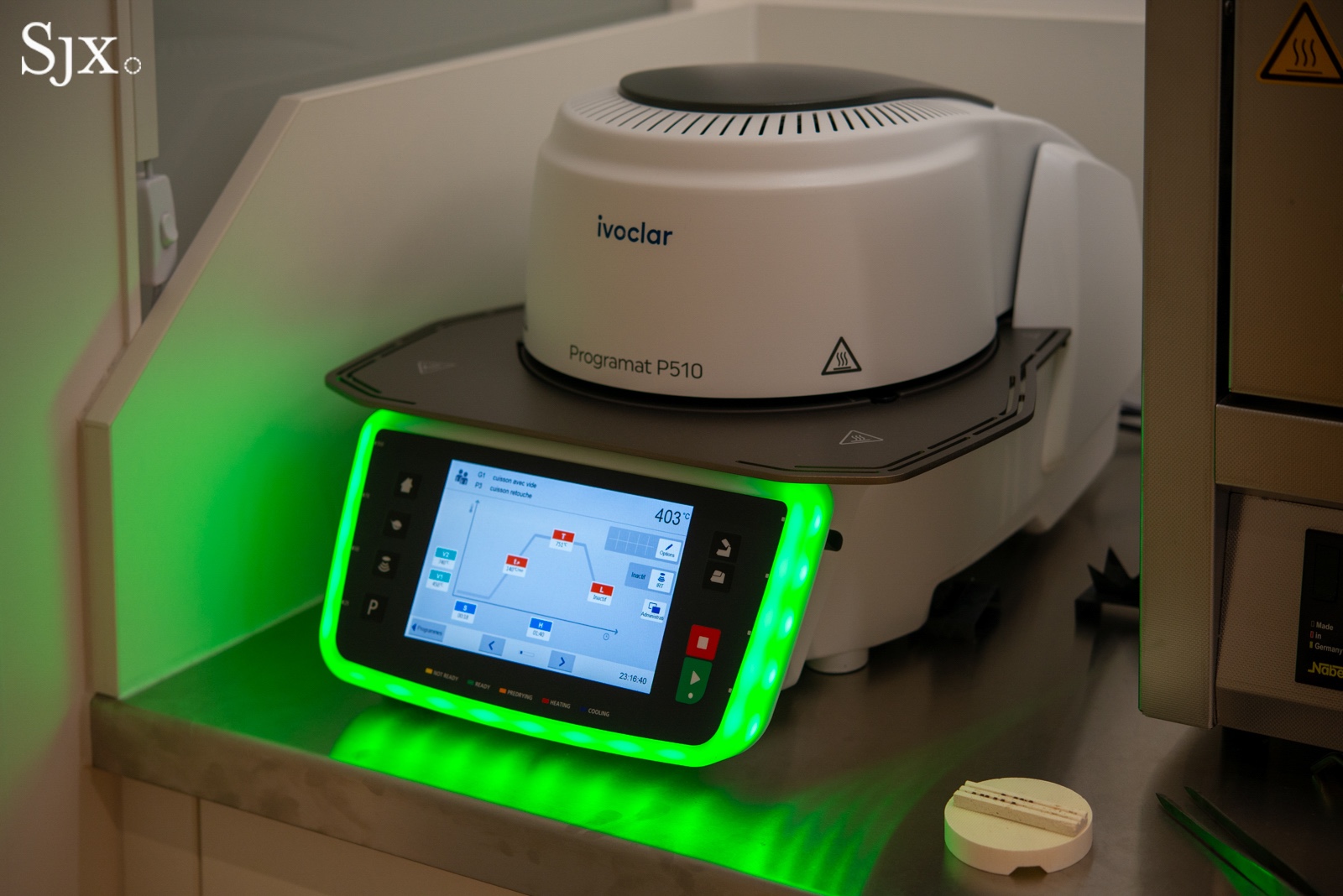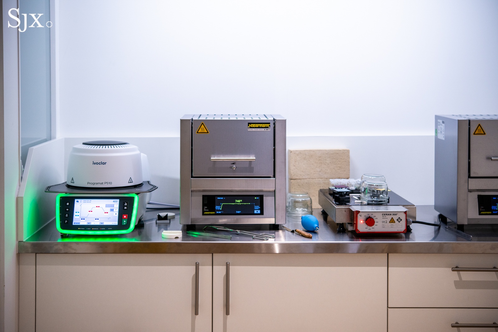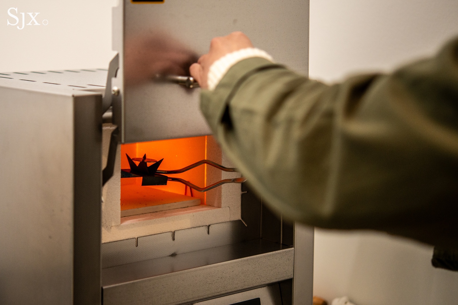 Things start heating up when the dials are transferred to the firing station. The firing process begins by placing the dial in a dental-grade vacuum furnace, akin to a small oven that sucks out all the air while maintaining a precisely controllable temperature. This type of machine is more commonly used by dental technicians to create ceramic crowns, but it works just as well for enamel dials.