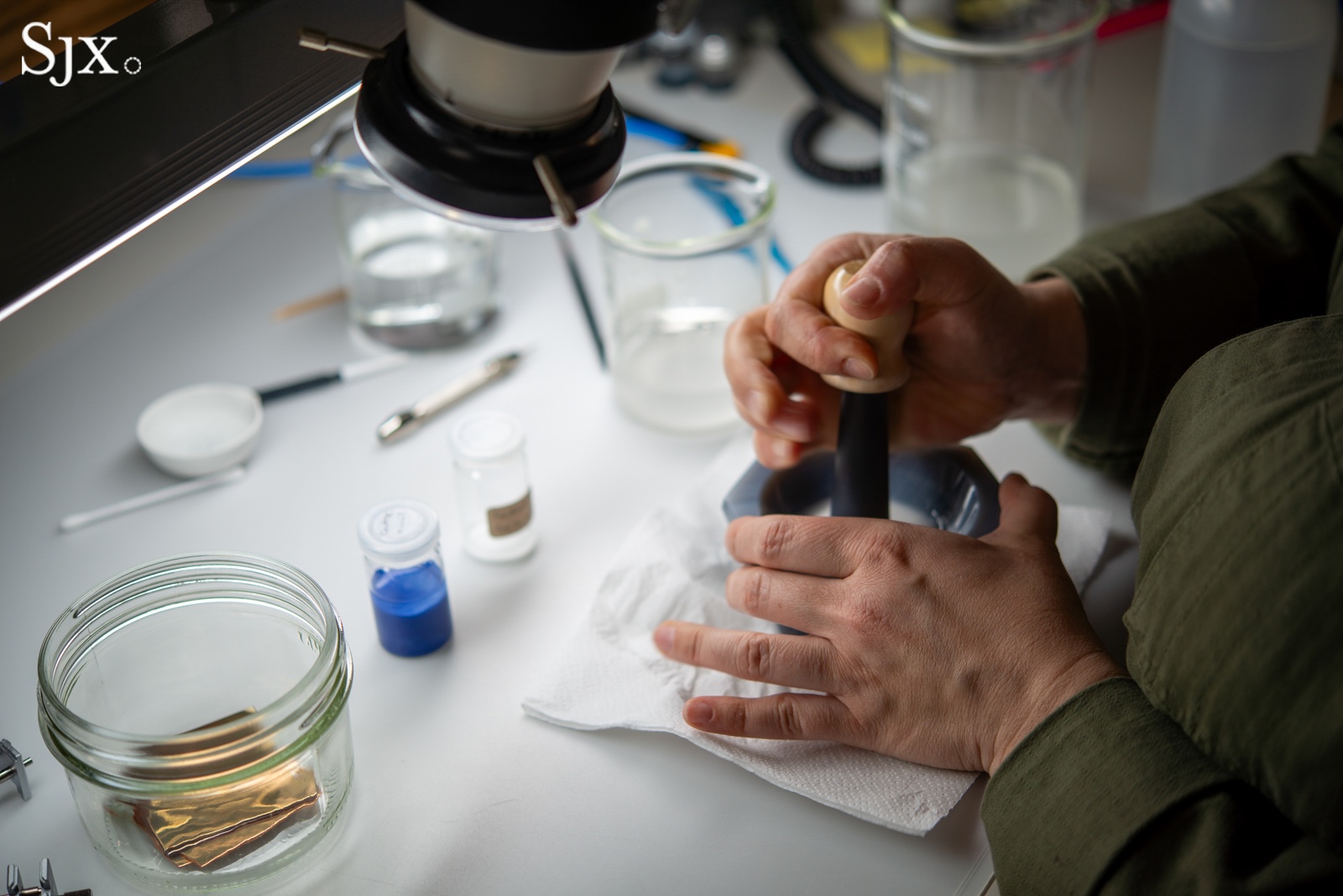 The enamel is then carefully painted onto the surface of a grey gold dial base. Grey gold is an alloy of gold and palladium, prized by enamellers because remains stable even after repeated firings. To help the enamel adhere evenly, the dial blanks are left with an intentionally coarse unpolished surface.