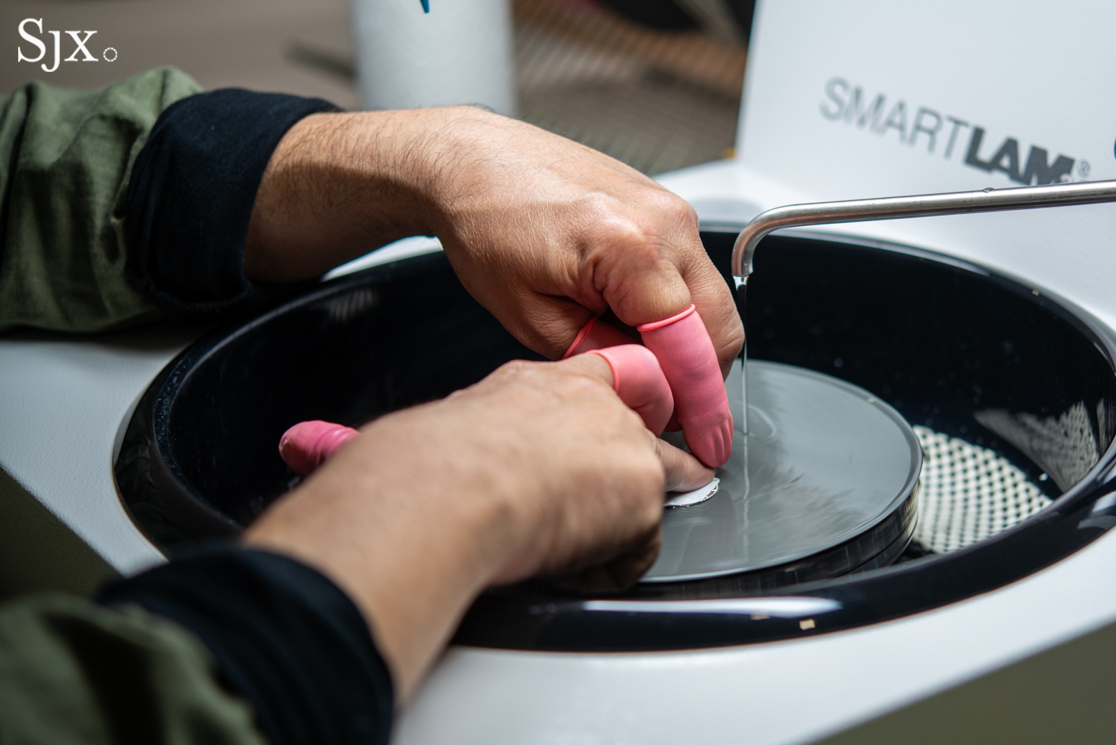 After a dial has been fired and found to be within spec, the polishing stages begin. The dials are ground against progressively finer polishing wheels, following the same steps used to achieve the perfect optical-grade finish of eyeglass lenses. This methodical step-by-step polishing process eliminates the dimpled orange peel-like texture that is often seen on lesser enamel dials.