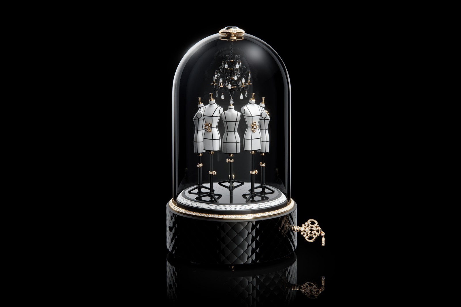 Priced at over US$2.7 million – and sold quickly after launch – the Couture O’Clock Musical Clock is whimsical, complex, and extremely elaborate. Very much typical of Chanel’s house style, this is a clock that incorporates a music box and automaton. The music box plays a tune that was reputedly a favourite of Coco Chanel, while the automaton is a carousel with dancing mannequins.