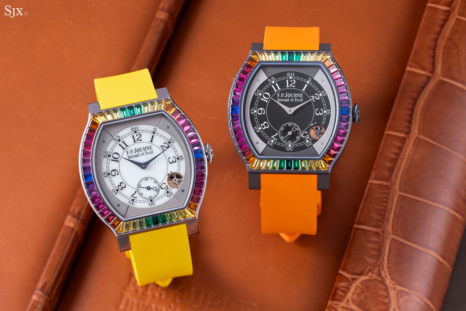 The latest Élégante is atypical of F.P. Journe. In fact, it’s the only F.P. Journe watch I know of with in “rainbow” colours. And the rainbow on the bezel isn’t even precious – the “gemstones” are actually glass-ceramic composite.