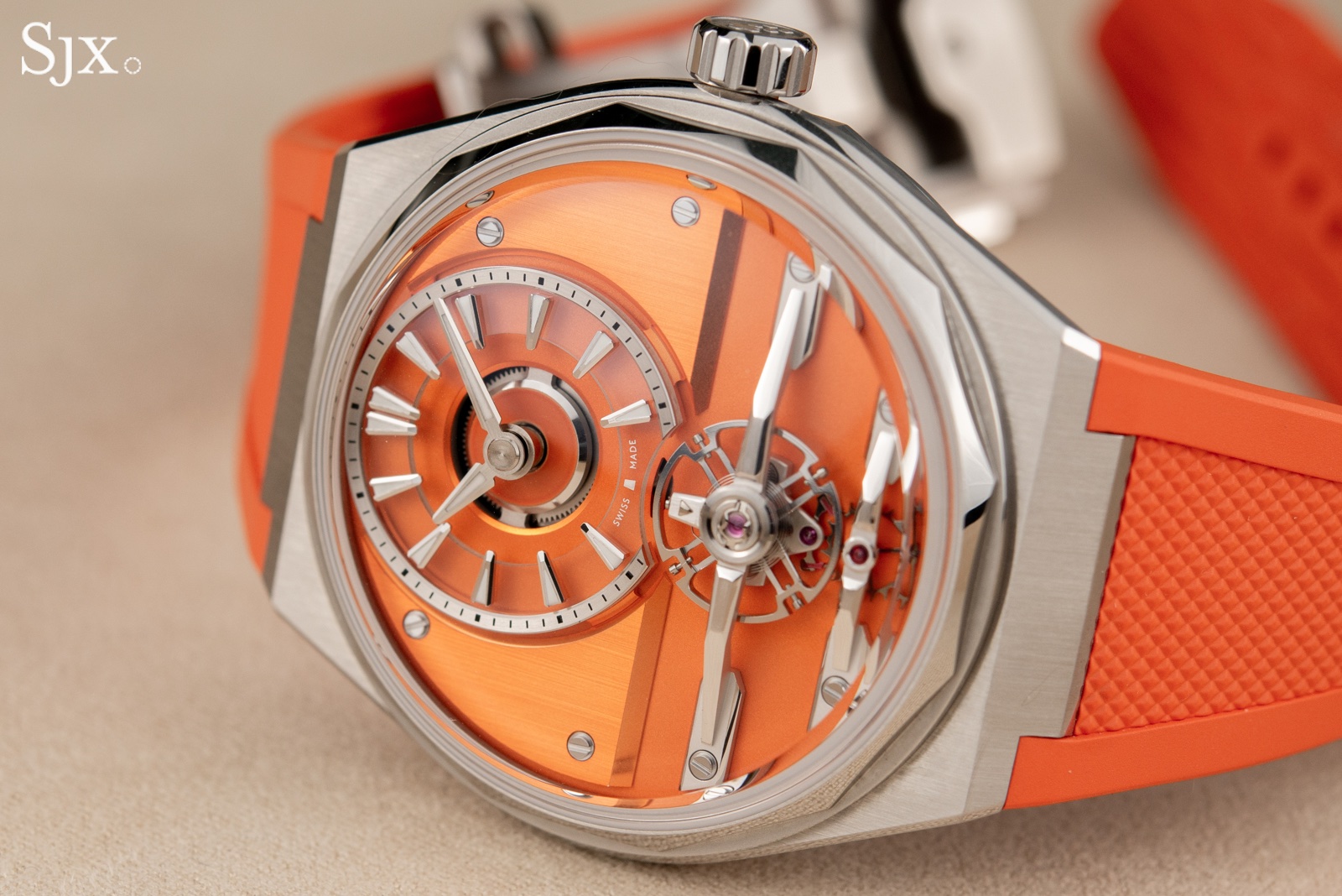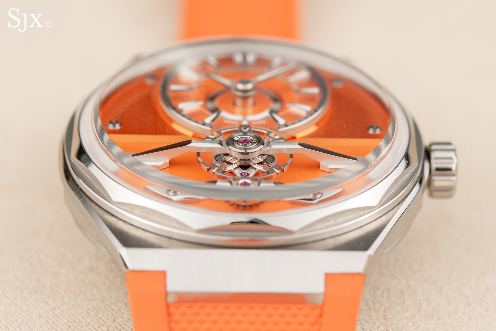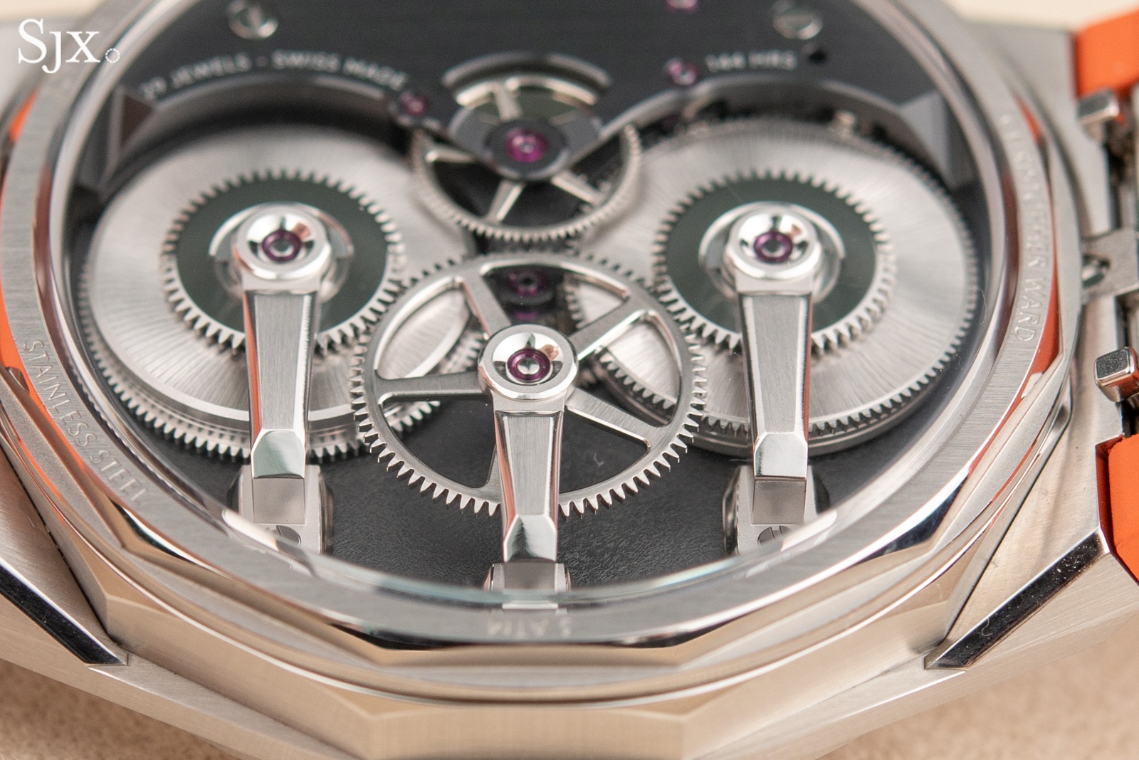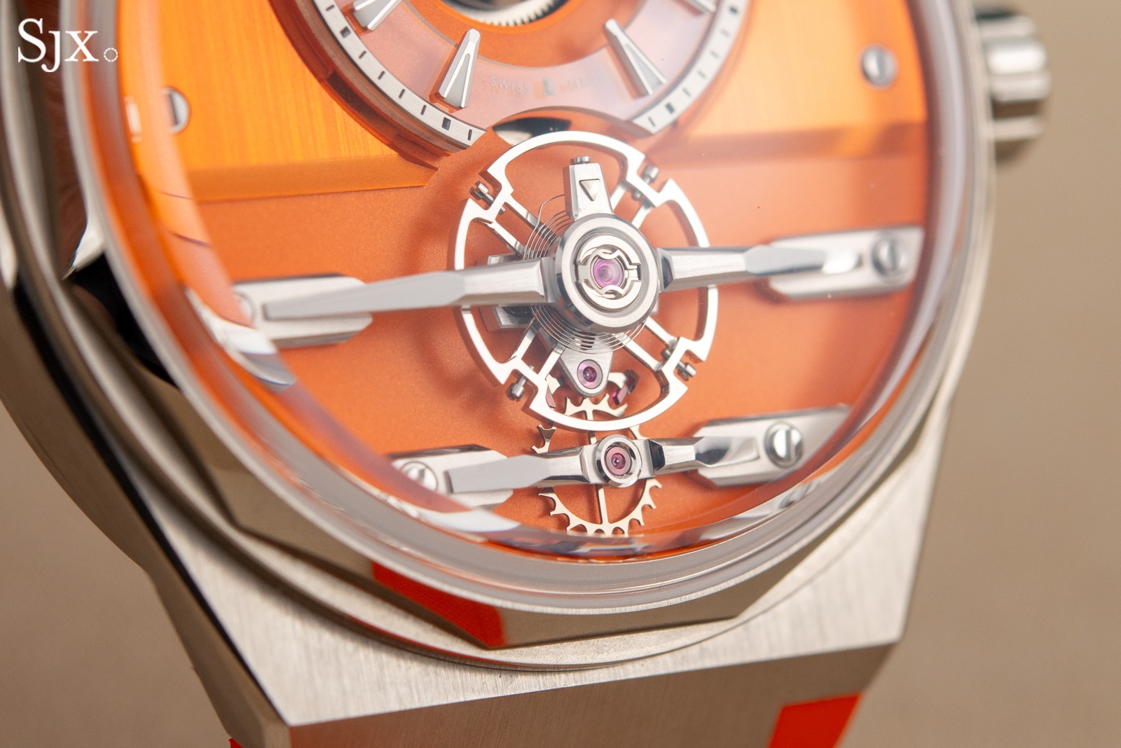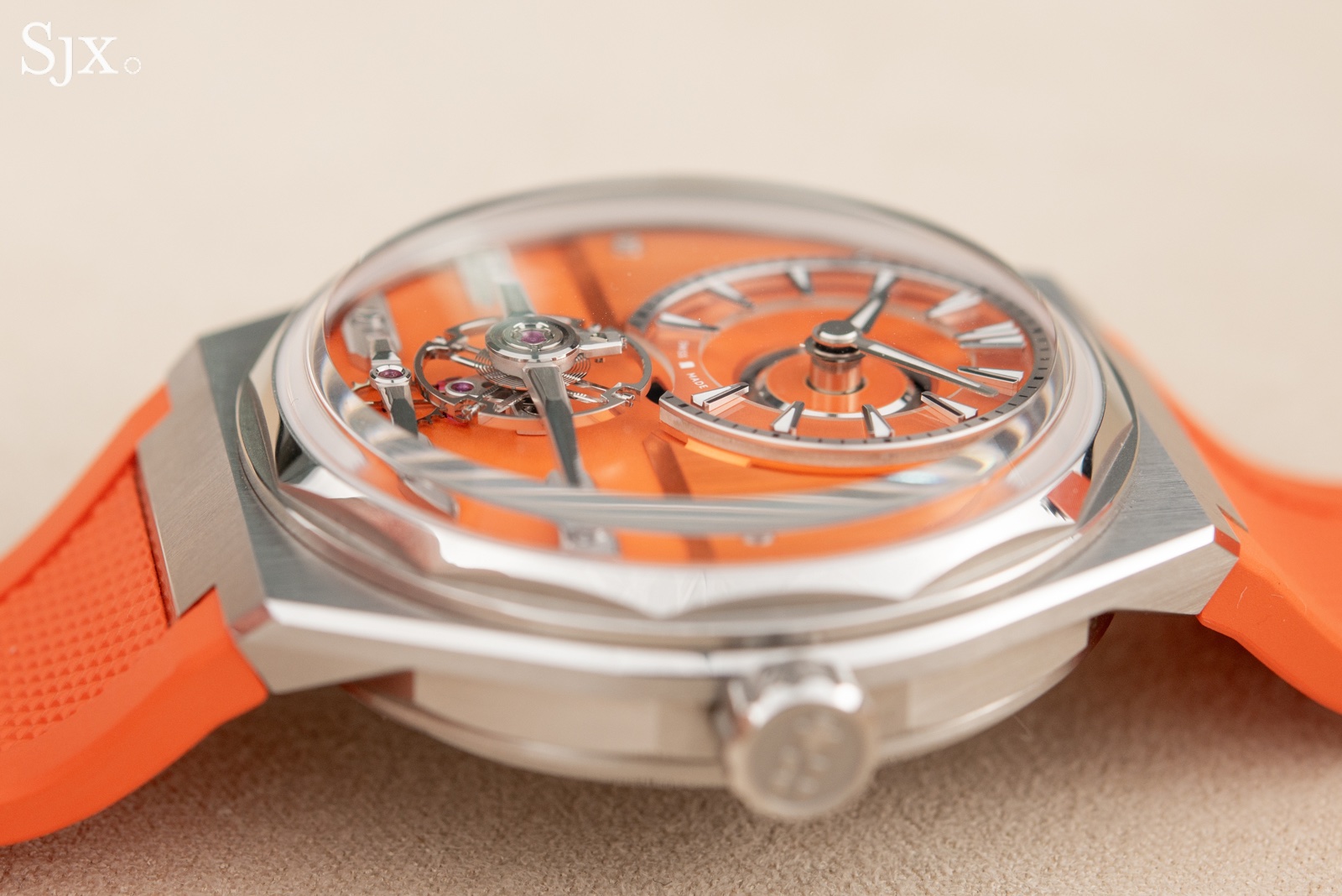 Regardless of colour, the mix of vertical brushing and frosting creates a pleasing backdrop for the offset sapphire crystal dial and the escapement, which is fully exposed in three dimensions, sitting up above the dial like an escapement model.