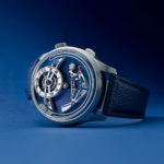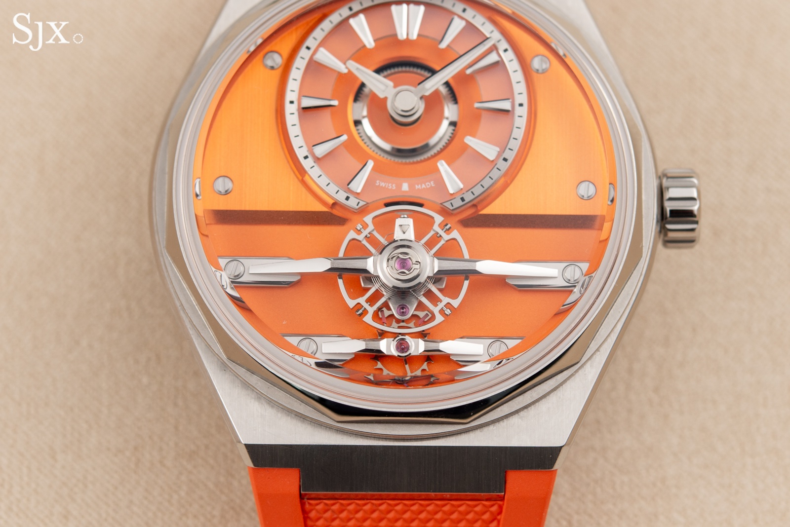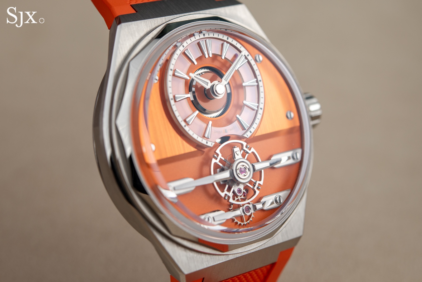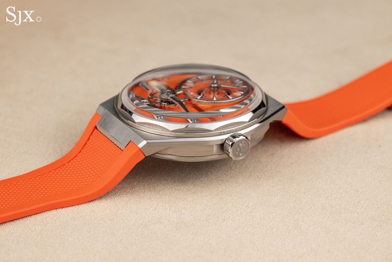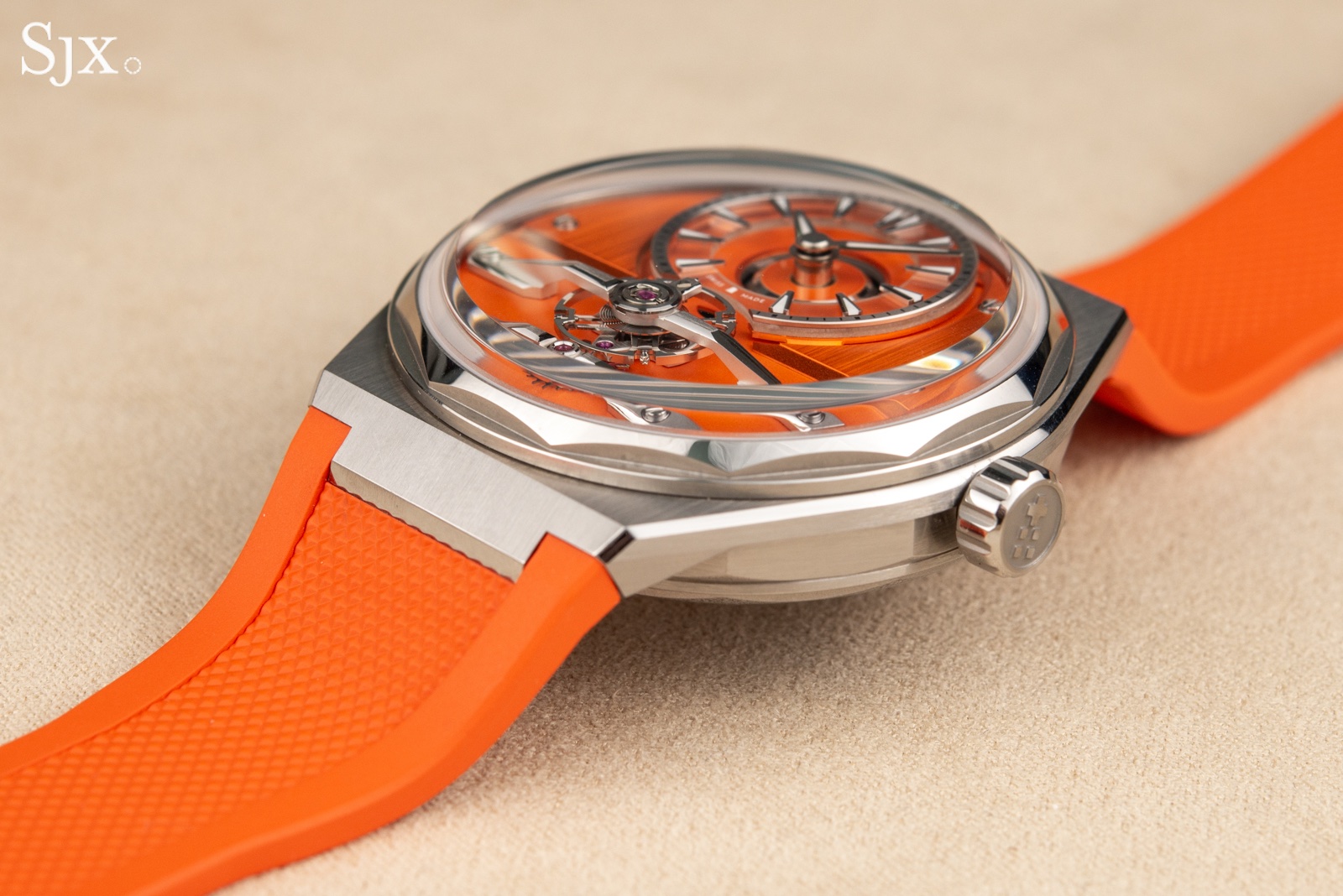 Regardless of colour, the mix of vertical brushing and frosting creates a pleasing backdrop for the offset sapphire crystal dial and the escapement, which is fully exposed in three dimensions, sitting up above the dial like an escapement model.