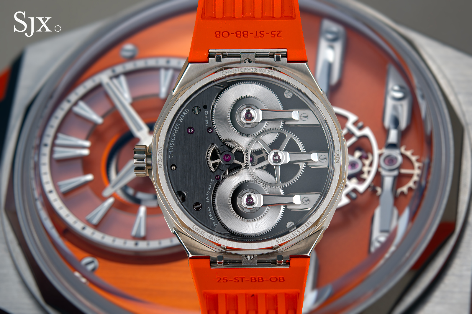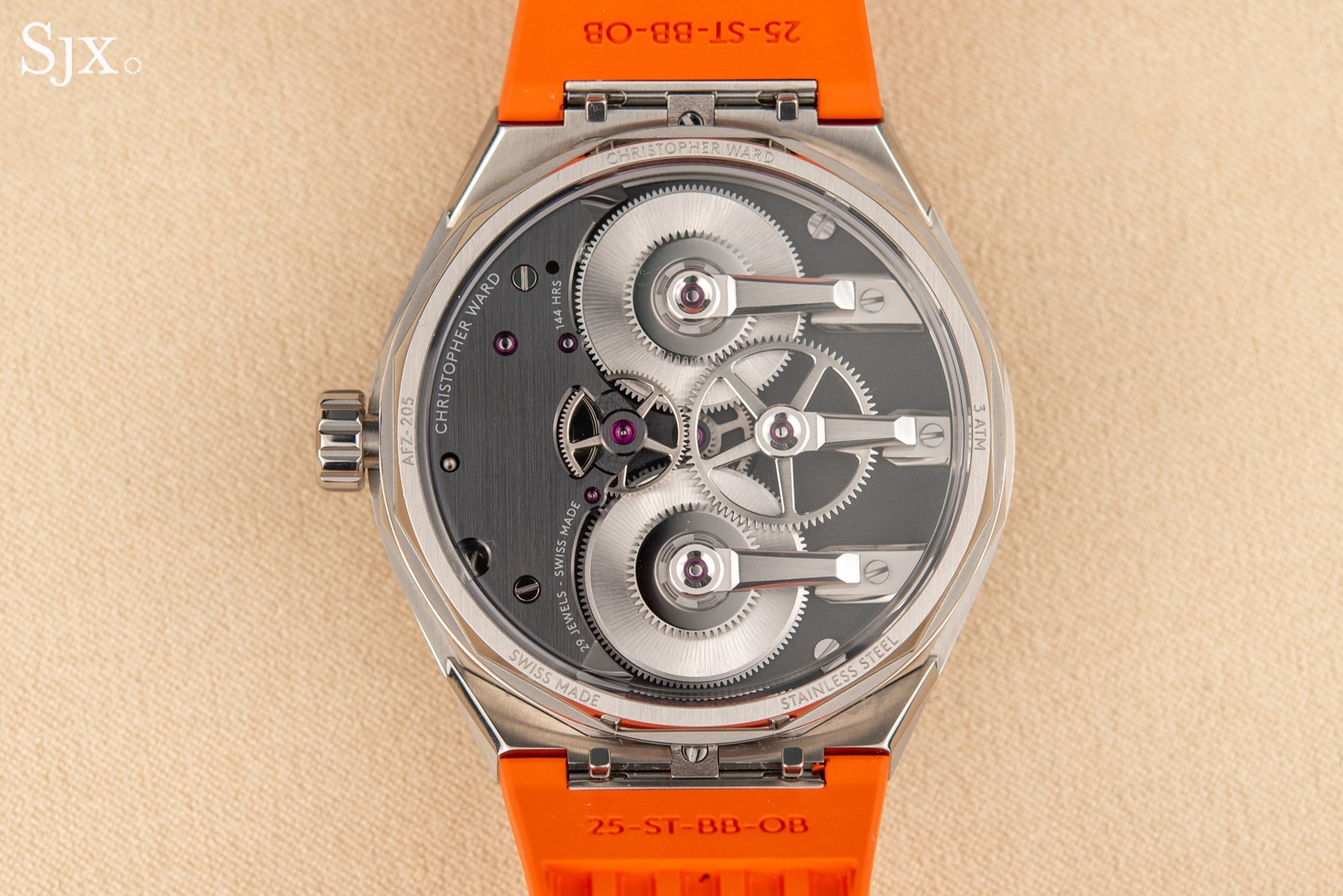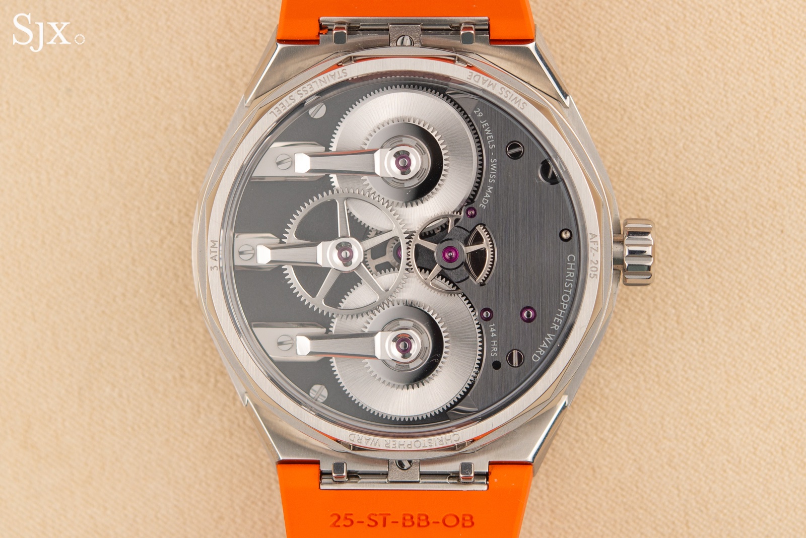 The view through the case back shows off more three-dimensionality with individual steel bridges for each barrel. You’ll find the DNA of a Valjoux cal. 7750 if you peel the onion, and it’s a competent and visually engaging movement.