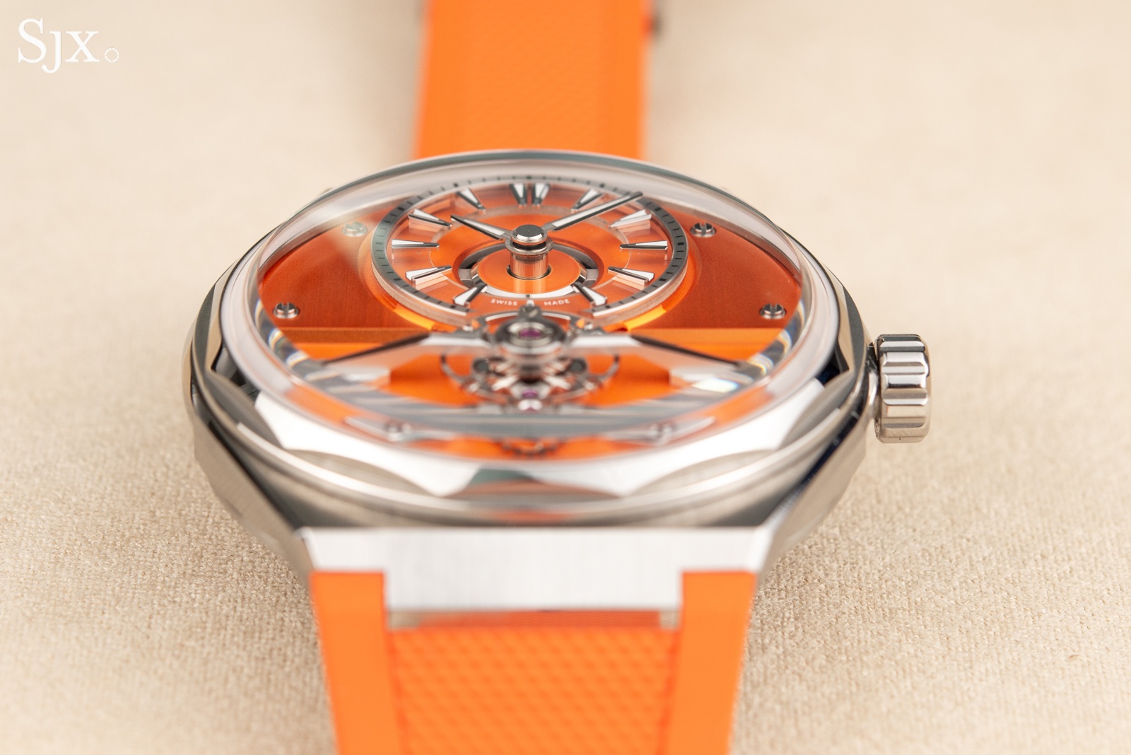 The dial itself is a small doughnut-shaped piece of sapphire crystal that reveals a hint of the motion works beneath the dial. The hour markers are affixed with adhesive, as is typical for applying indexes to sapphire, and like the hands they are deeply straight-grained and faceted to catch the light. Overall the dial looks expensive from all angles and even under magnification it’s hard to fault.