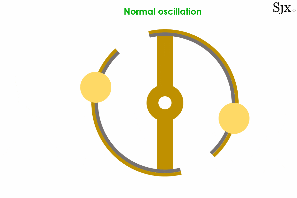At low temperatures, the brass strip contracts faster than the steel inner layer, causing the curves to move outward. This would in turn increases the moment of inertia of the balance and slow down the stiffened balance. At high temperatures the opposite was the case, with the brass expanding fast and turning the curves inward, decreasing the moment of inertia. This would speed up the weakened balance. The short animation below provides a dynamic explanation of how the device works. At first sight, the system seemed foolproof.