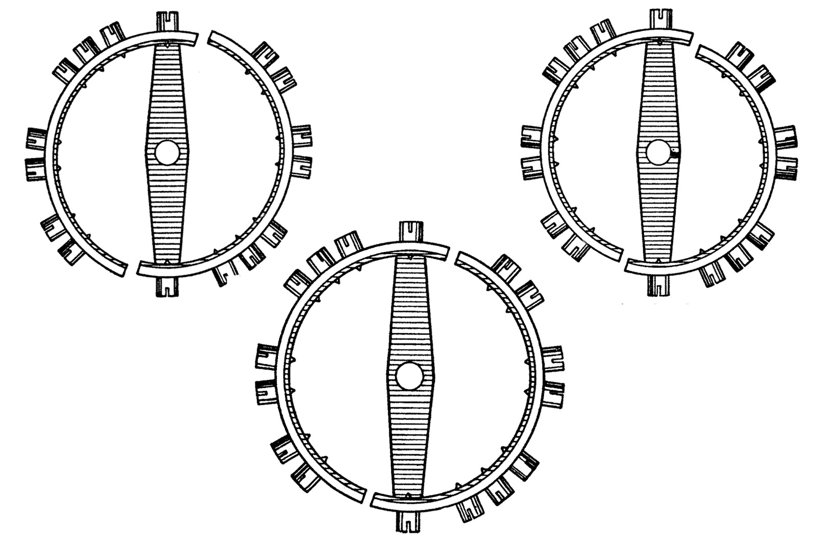 The basic construction of a bi-metallic balance features cut compensation arms made of an inner layer of steel and a thicker, outer layer of brass. Screws or weights would be typically fitted to these arms, much like in modern balances.