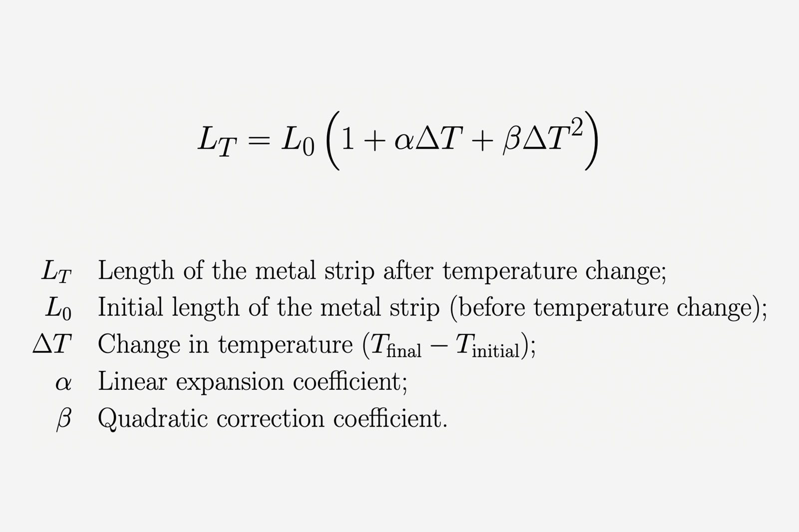 This is not the case for sensitive instruments like hairsprings, so the quadratic correction term (with β coefficient and squared temperature change) is required. The full equation with the quadratic correction term has long troubled watchmakers when compensating for temperature.
