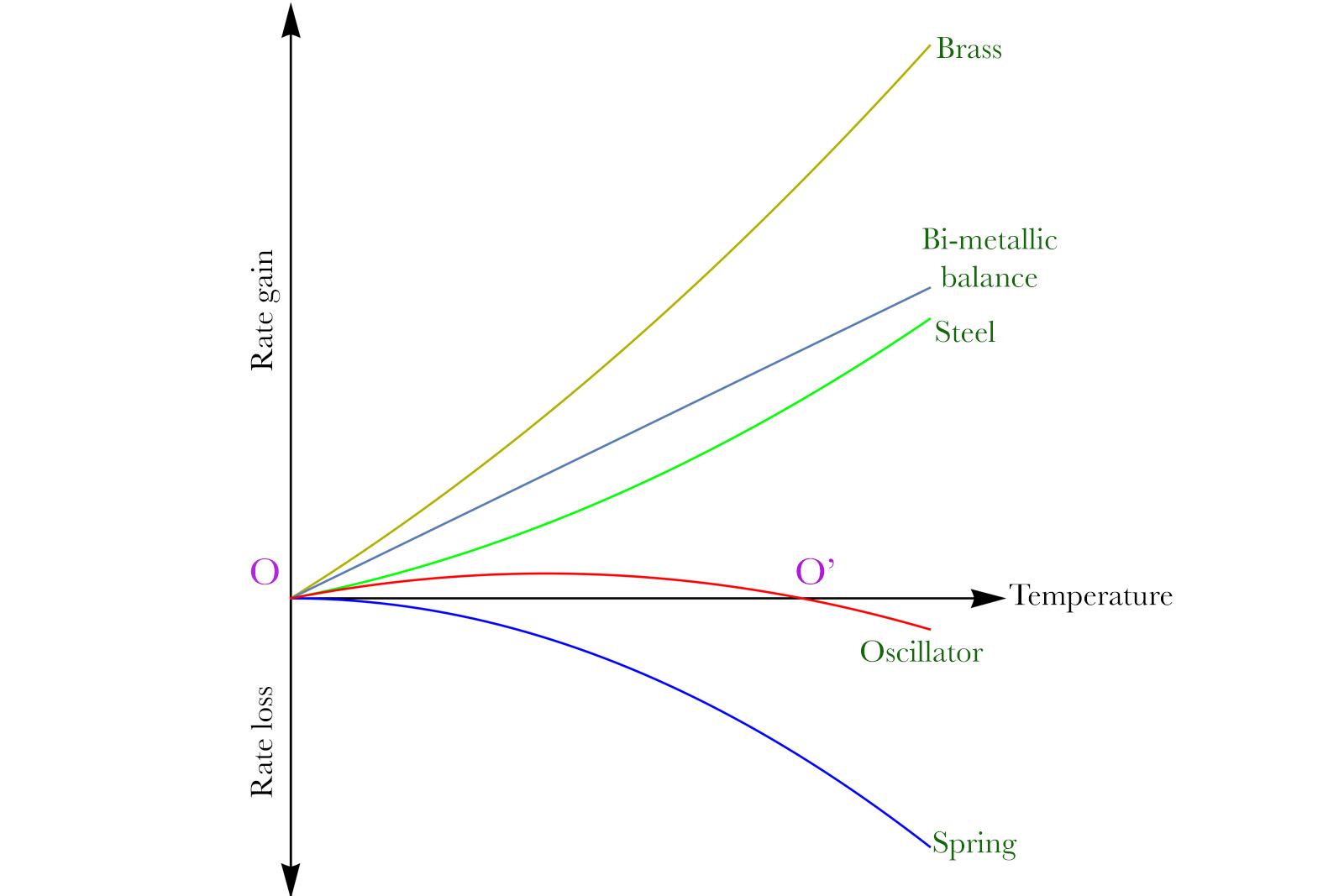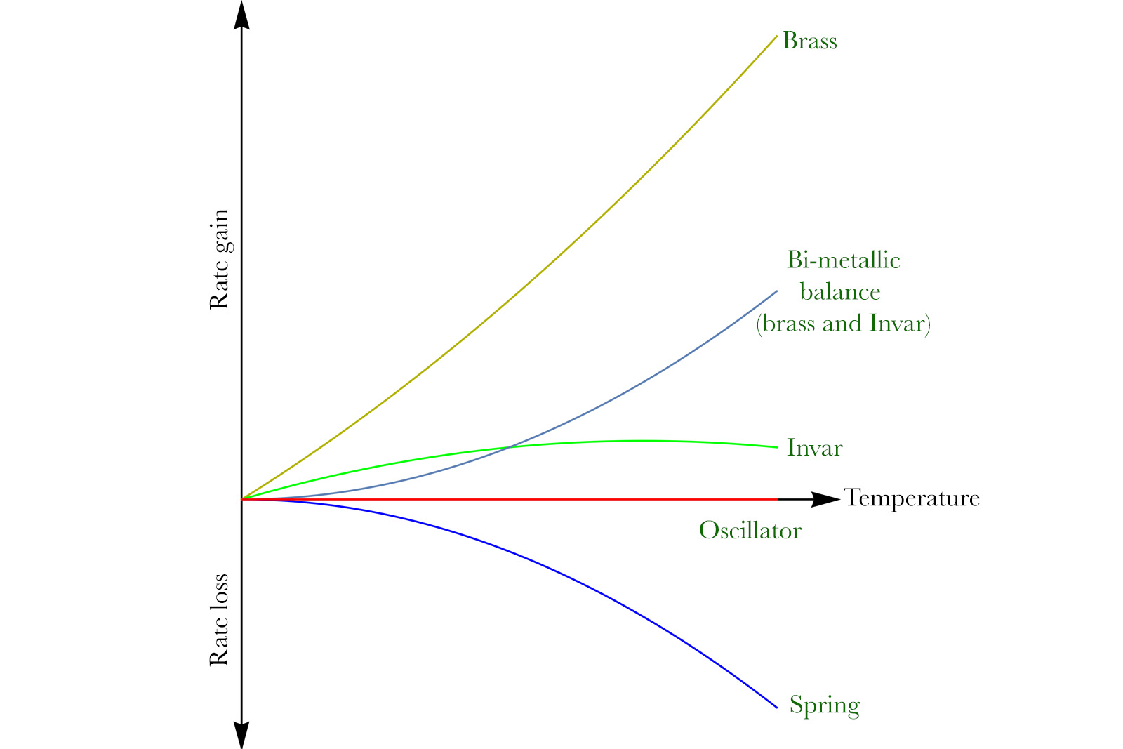 The dark yellow line shows how the brass expansion affects the running rate. The green line shows how the steel alone affects the running of the balance. Their joint action is shown by the straight line in grey. By coincidence, the quadratic coefficients (β) of brass and steel are sensibly the same, so they cancel out for the bi-metallic balance. This is why the dependence between temperature and rate change for such a balance is linear.