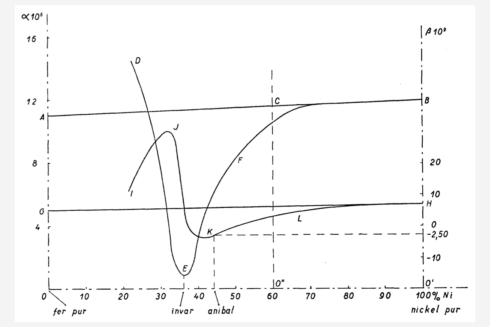 Diagram extracted from L. Defossez, Théorie générale de l’horlogerie Tome II, showing the odd curves for the α and β coefficients in iron-nickel alloys; α’s variance with composition is shown by curve DEFG, while β’s is shown by curve IJKL