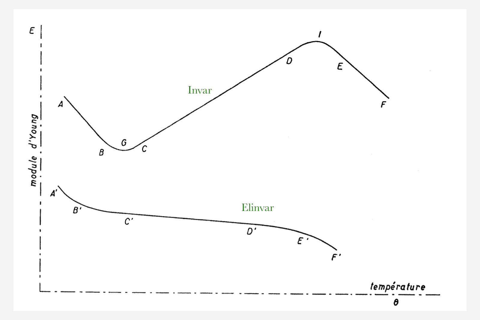 Figure extracted from L. Defossez, Théorie générale de l’horlogerie Tome II, showing the little variance of Elinvar’s Young’s modulus with temperature; on the segment C’D’ the change is almost null.