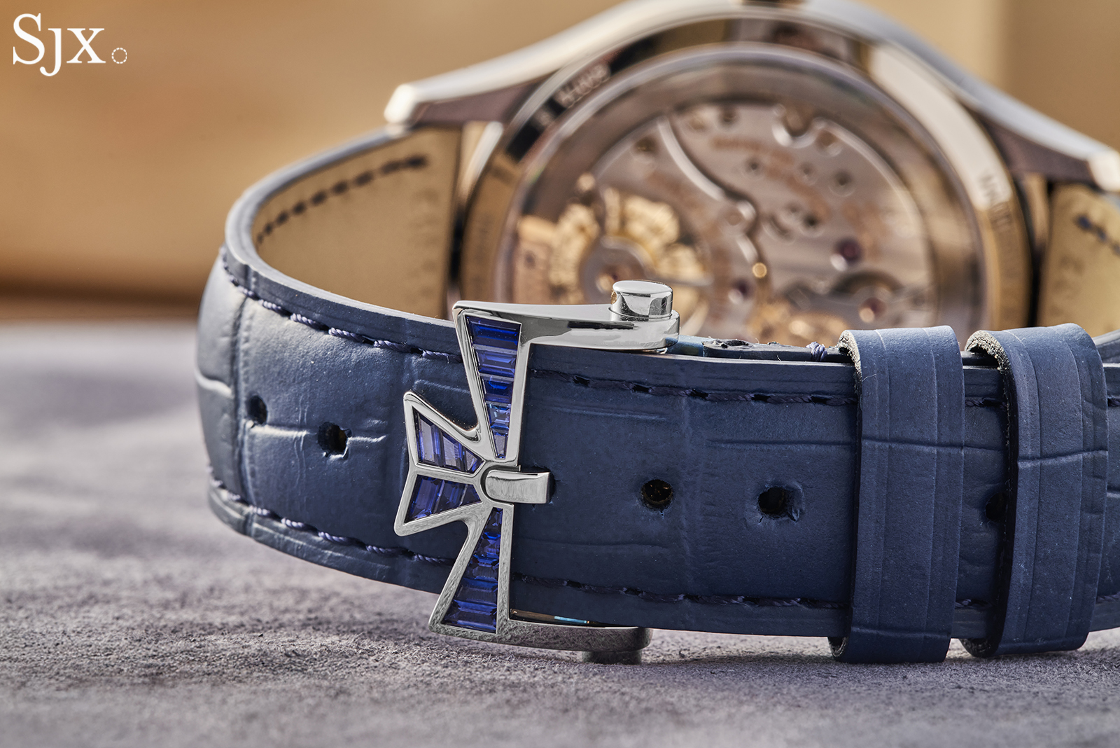 The guilloche is subtle at arm’s length, and surprisingly, even the sapphires are. The case is set with 96 baguette-cut sapphires – a substantial number and weight of gemstones that exemplify another kind of artisanal craft. But surprisingly the watch is far from “bling”, it is relatively discreet and also very blue. The case sides are not set with sapphires, and look a little naked.