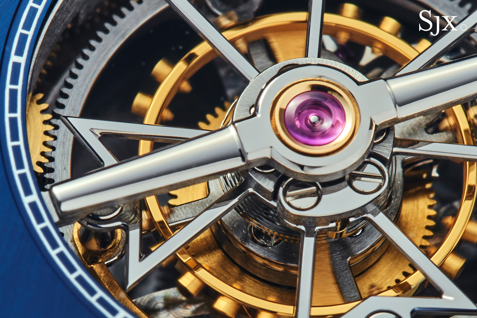 The cal. 2160 inside is a straightforward tourbillon movement, except for its winding mechanism. It features a peripheral winding mechanism that employs an arc-shaped weight in 22k to wind the barrel.