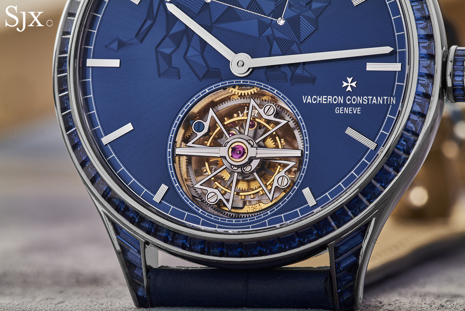 The Tribute to the Celestial is a combination of familiar elements, but executed in a surprising way. It’s centred on traditional techniques, namely the hand guilloche dial and gem-set case, but modern in approach and aesthetics. The palette is largely blue and almost monochromatic, while the guilloche forms a geometric, polygonal motif.
