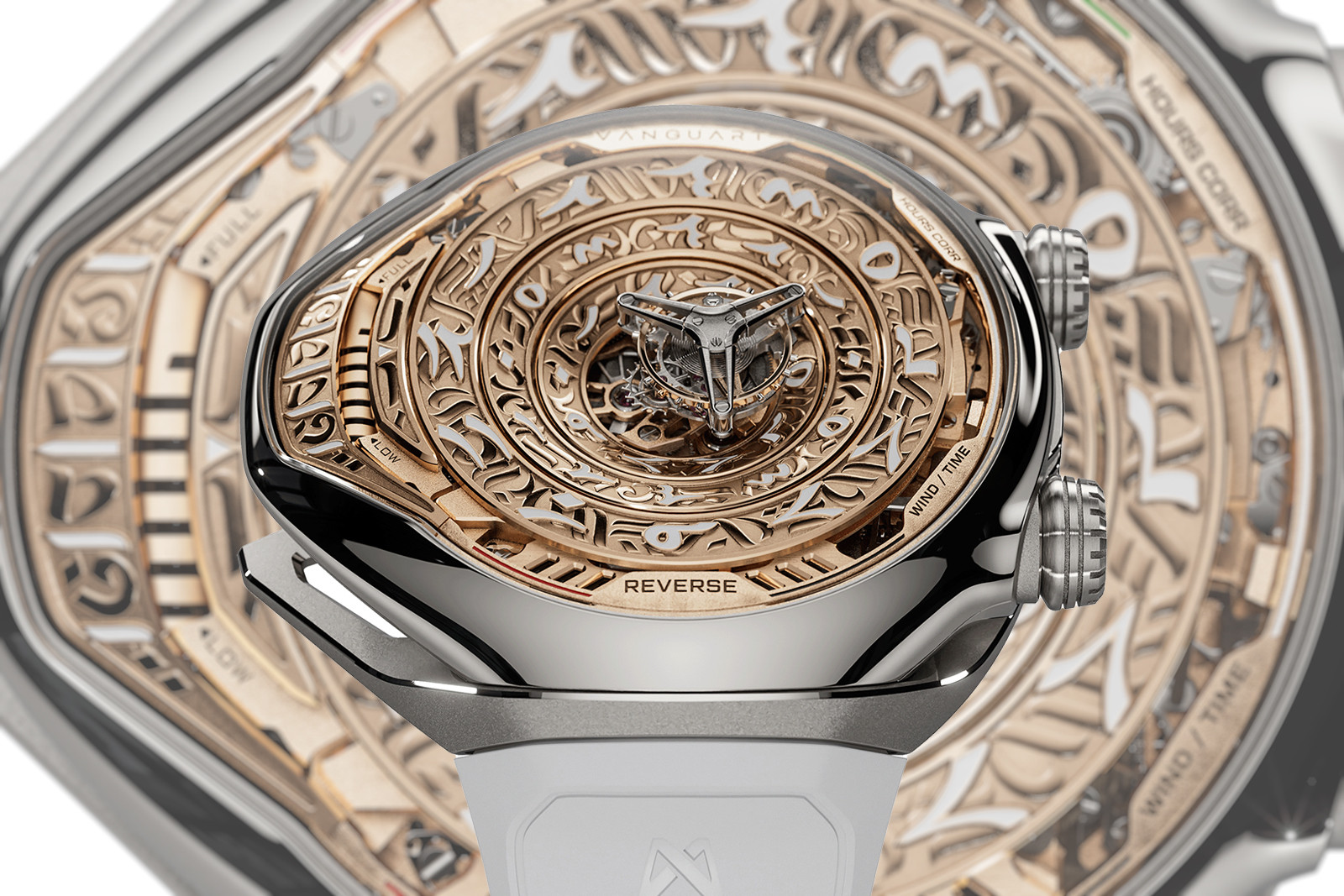 The fluid, almost organic lines of the case stand in contrast with the stylised, mechanical aesthetic of the movement. They contrast, but are complementary, with the case serving to frame the movement.