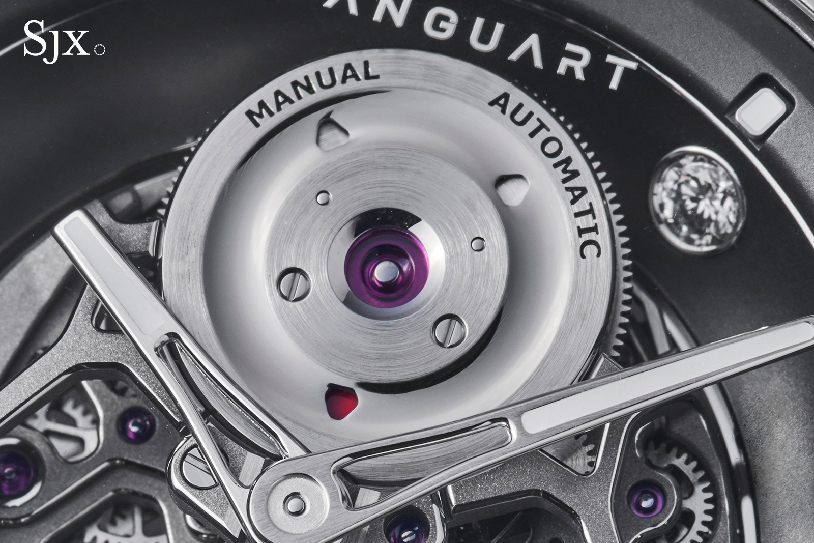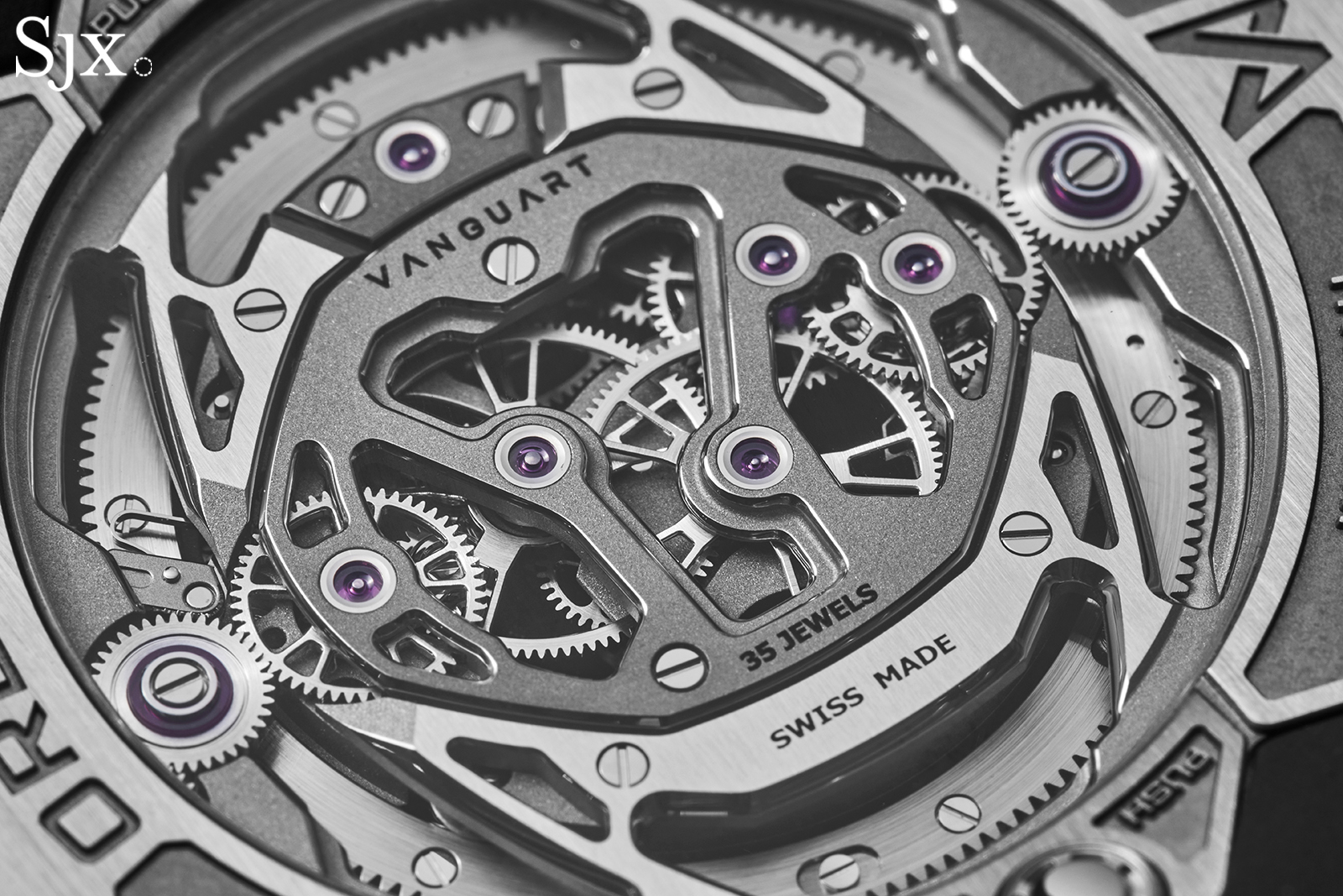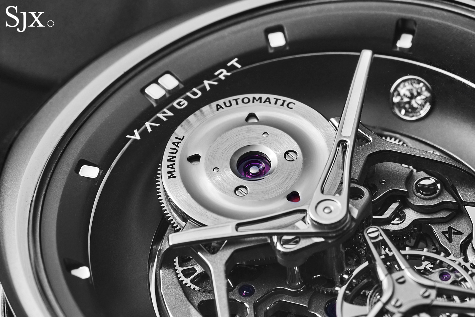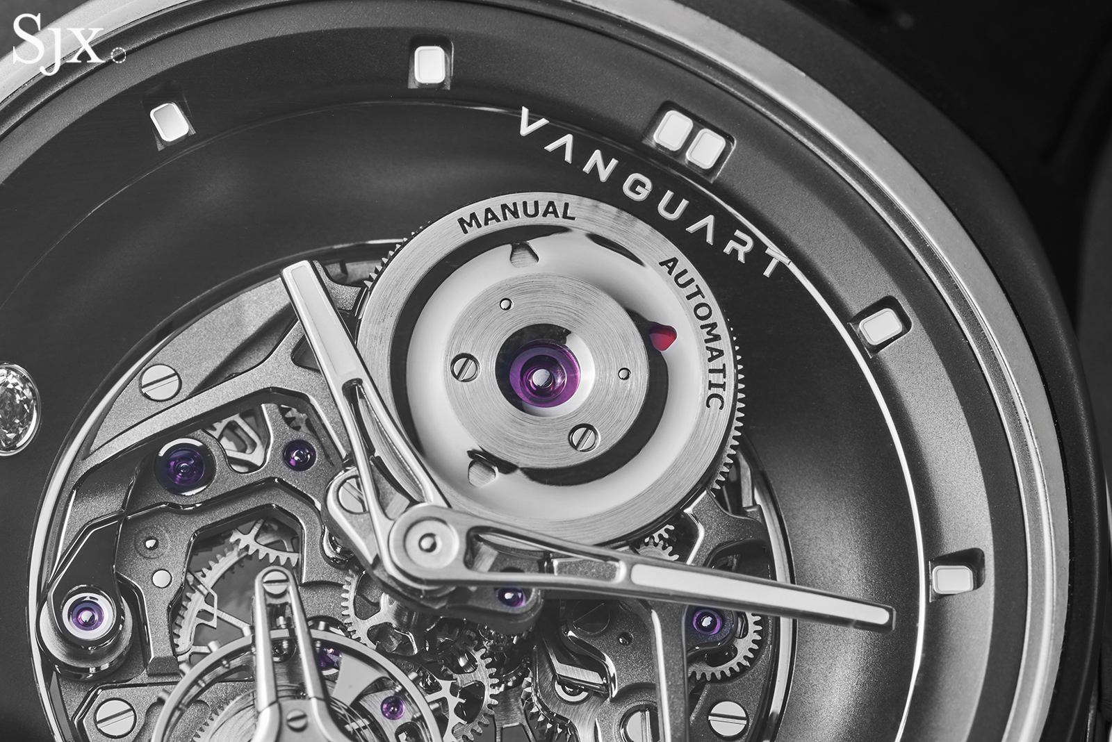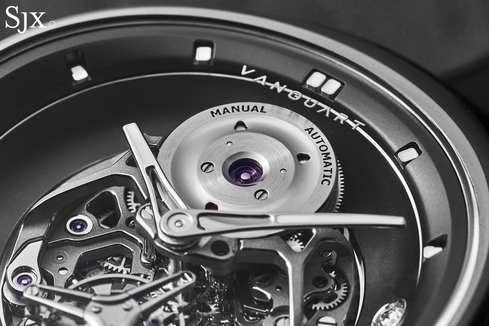 Despite the modern styling, Vanguart notes the finishing of the movement is done by hand. Examining the movement reveals this to be true, though it is not obvious due to the tone-on-tone surface treatment.
