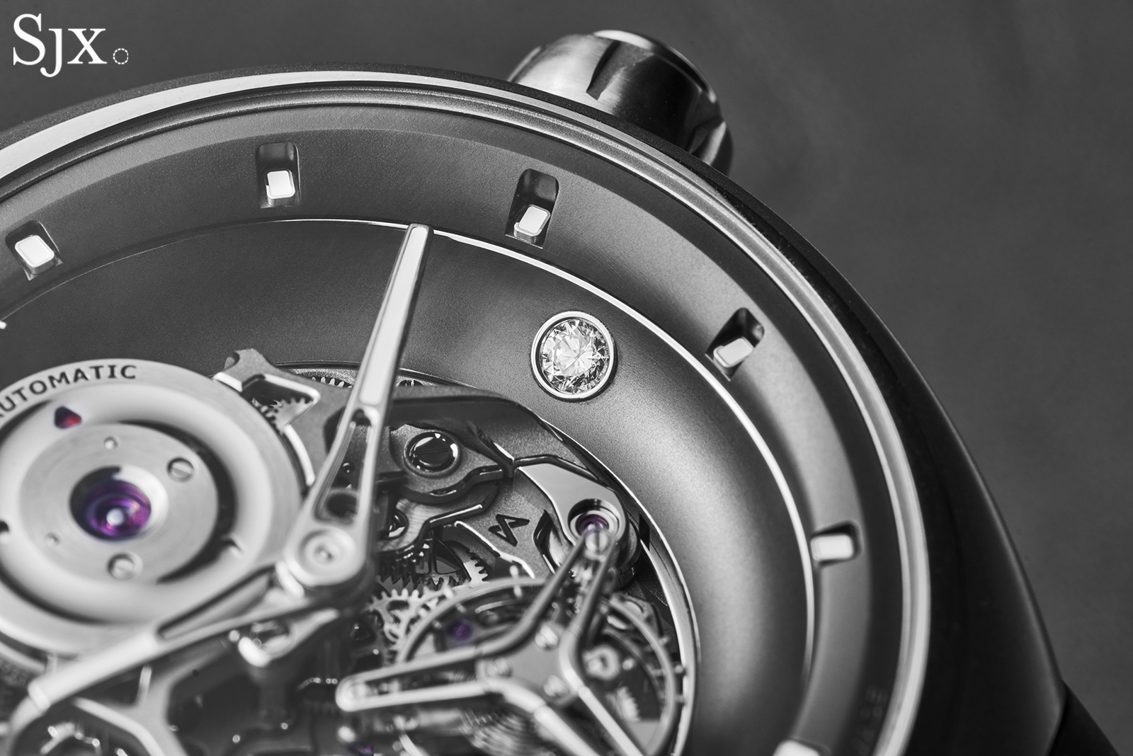The rotor on the front sits on a large gear that encircles the movement. This gear meshes with two sets of winding wheels, each mounted on a ruby bearing. This contrasts with most peripheral winding mechanisms that make do with a single winding wheel, which is typically not efficient enough given physics of peripheral winding.