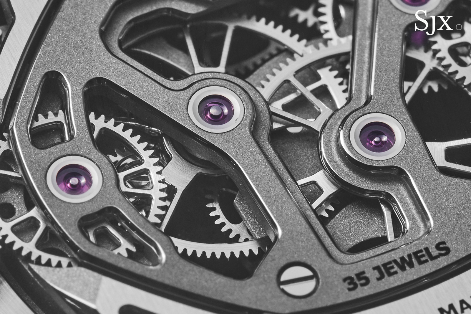 Interestingly, the dark grey bridges are not coated brass, but instead titanium. The titanium bridges are still finished with frosted top surfaces and prominent anglage, which is more of a challenge than on brass.