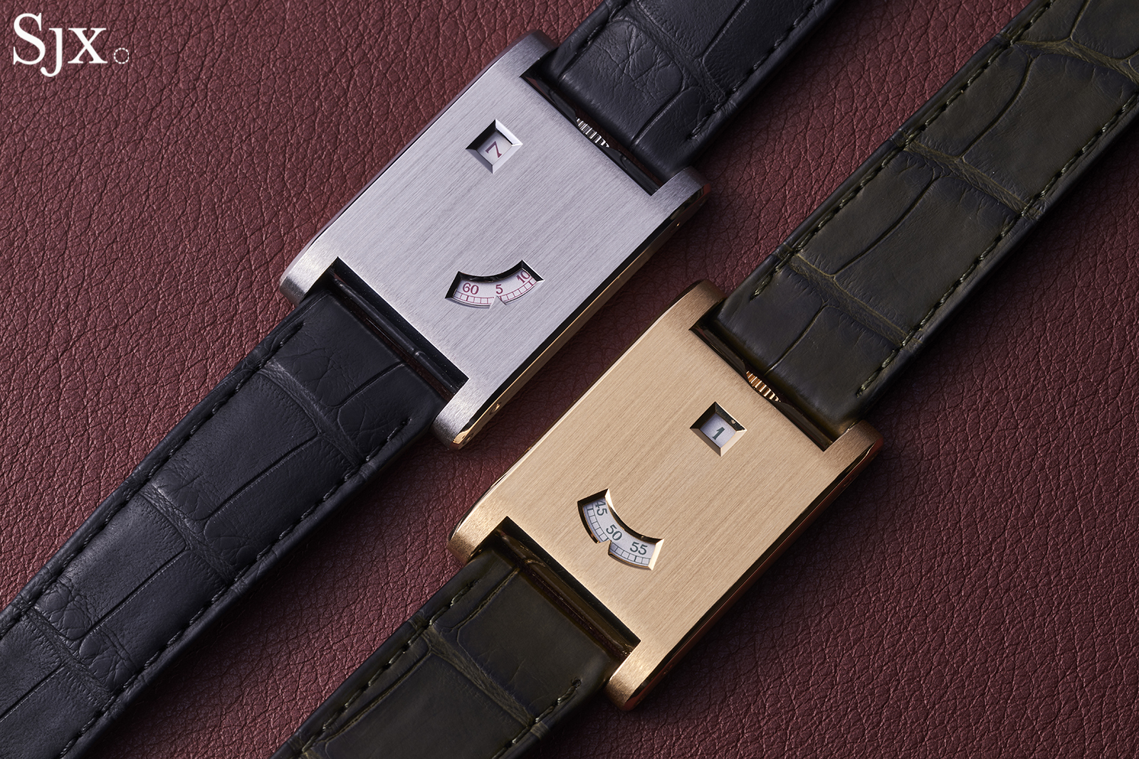 The Tank à Guichets “oblique” (left), and in yellow gold