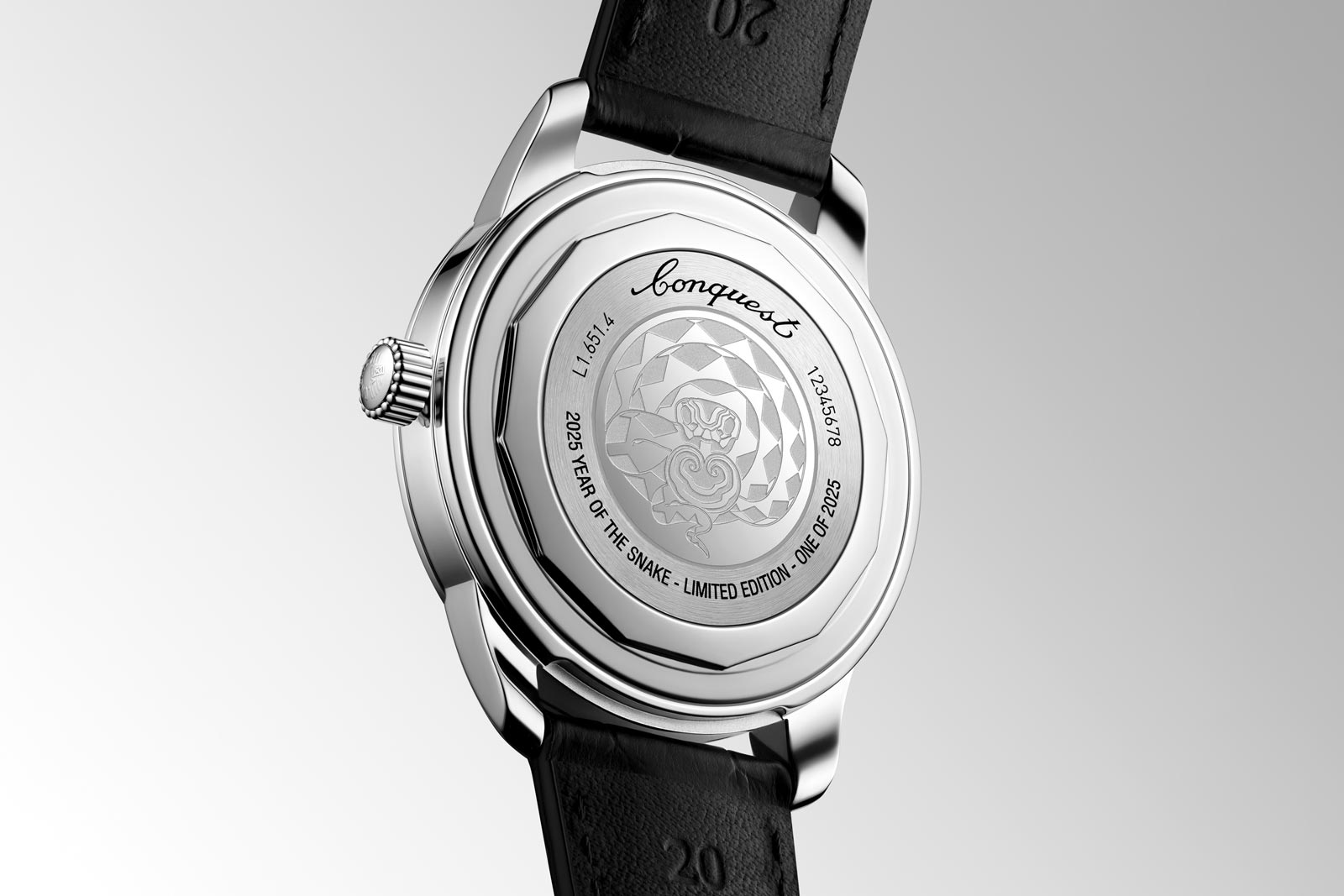 The Conquest Heritage Year of the Snake offers something more modern and striking, instead of the conservative look of the standard model that has a silver or black dial. I particularly like the fact that the snake motif is limited to an engraving on the case back, as having it on the dial would have been overly ornate.