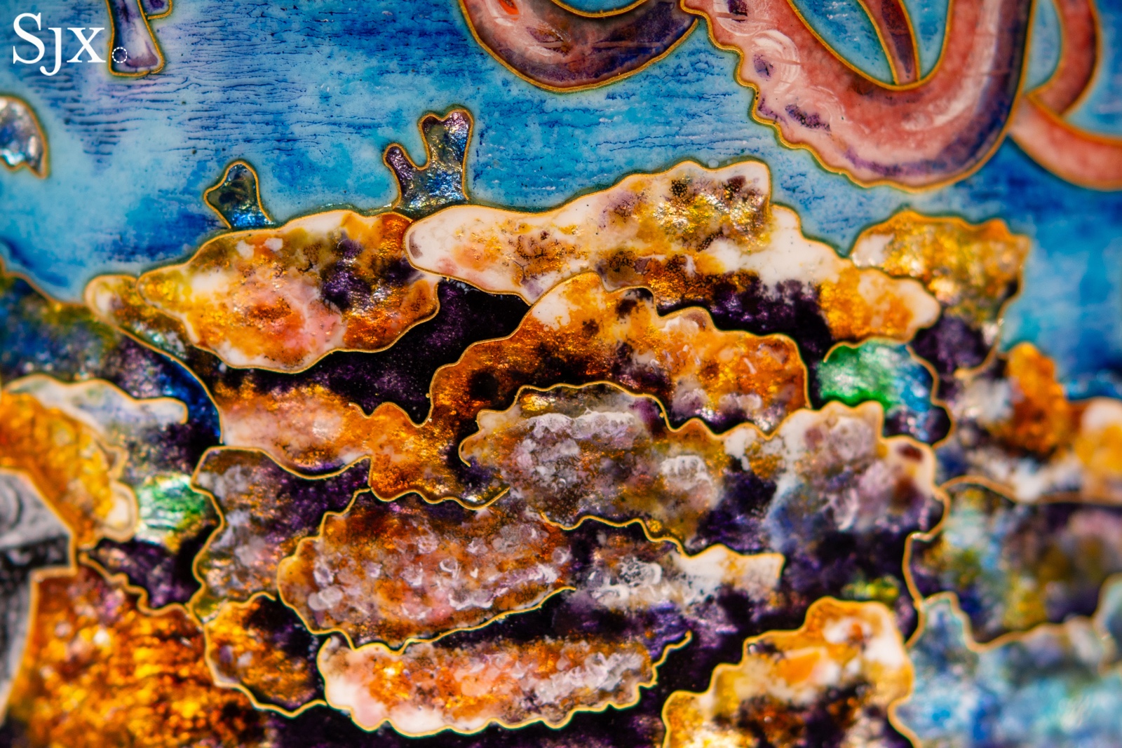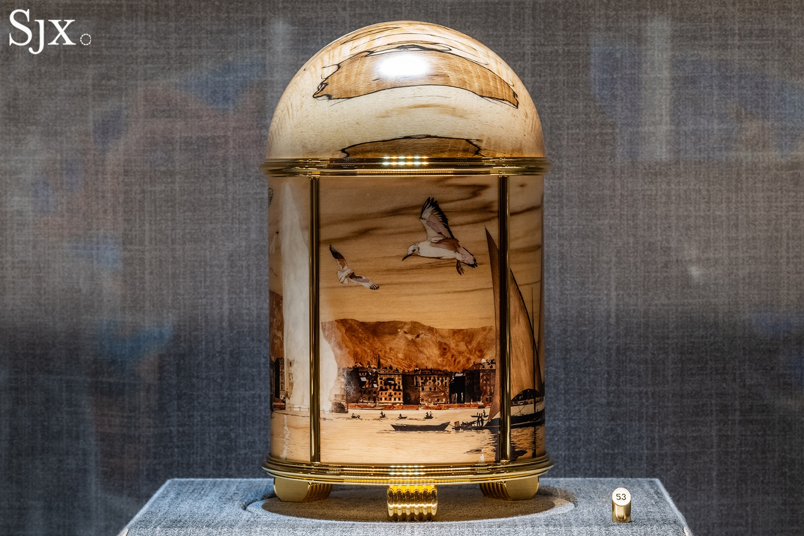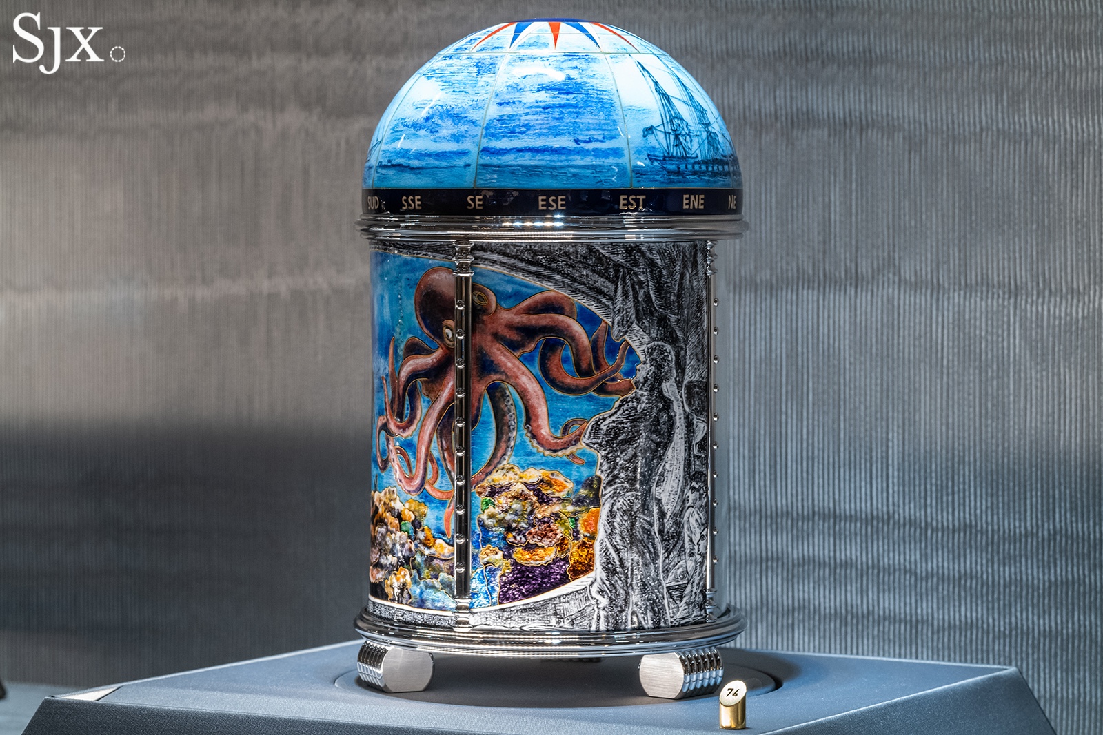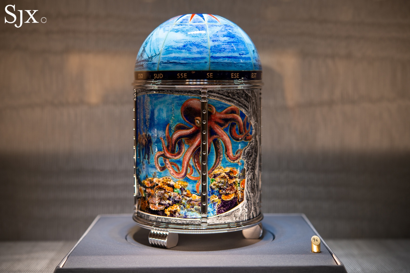 Turning now to Dome Clocks, the stand out piece for me was the Dome Clock ref. 20171M-001 “Nautilus”, which depicts the famously implausible deep sea diving scene from Jules Verne’s Twenty Thousand Leagues Under the Sea. This was one of my favourite stories as a child, and it was great to see it brought to life in 41 vivid layers of translucent and opaque enamel. (And those in the know will note that Thierry Stern’s yacht is also the Nautilus.)