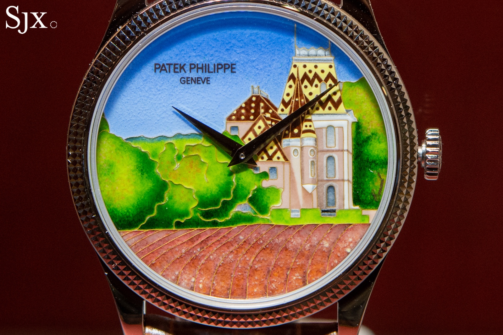 The Calatrava ref. 5177G-051 “Bordeaux” and ref. 5177G-050 “Burgundy” keep the oenophile theme going, rendering the iconic chateaus and estates of these regions in dozens of layers of translucent enamel. Both watches are powered by the micro-rotor cal. 240 and are limited editions of 10 watches each.