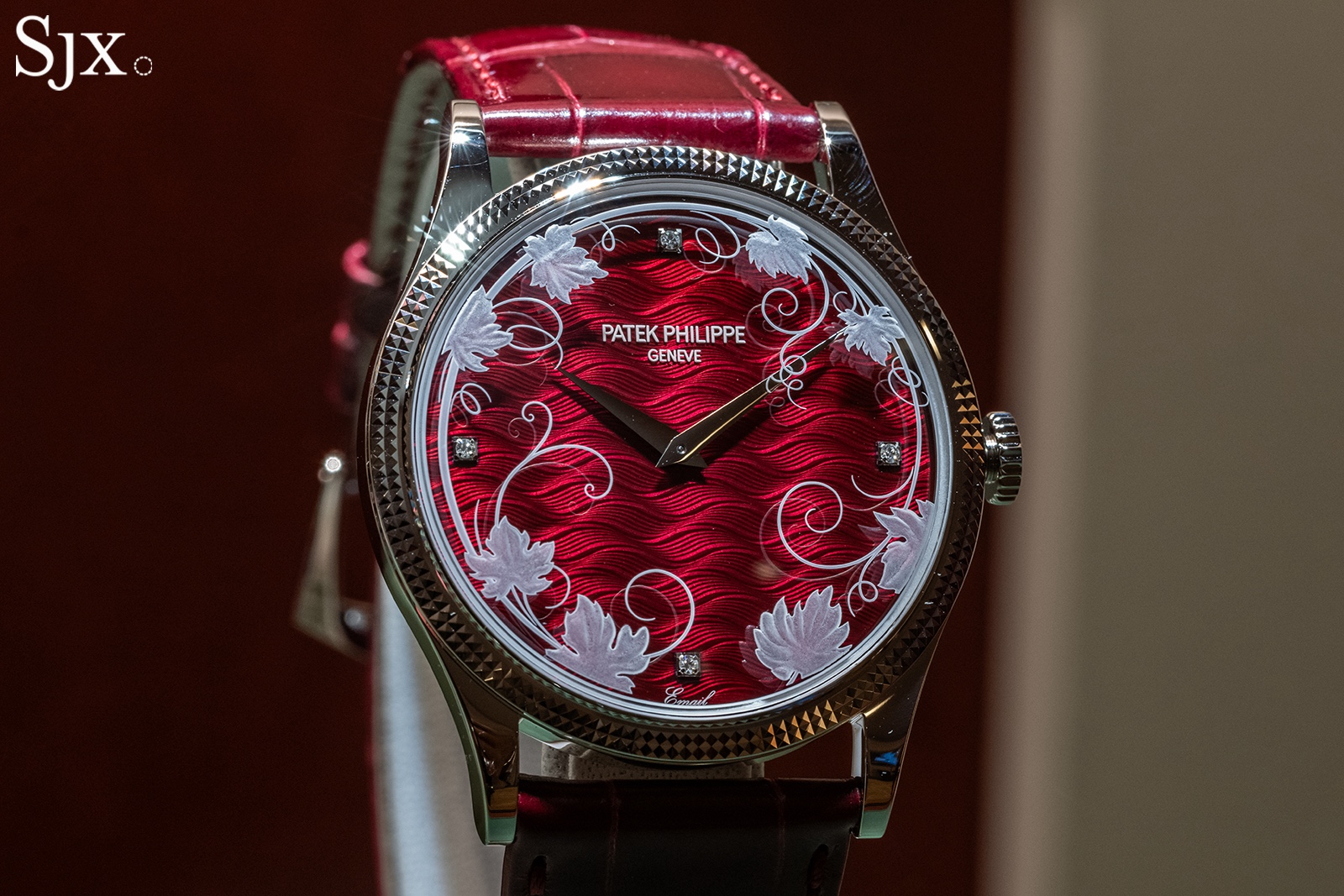 Turning to the Calatrava collection, and a different source of inspiration altogether, we have the Calatrava ref. 5177G-052 “Red Wines”, which features an intricate engraving on the inside of the crystal. I don’t recall seeing a watch crystal executed this way before, and the effect is striking, especially against the red guilloche dial (which is also available in white or rose).