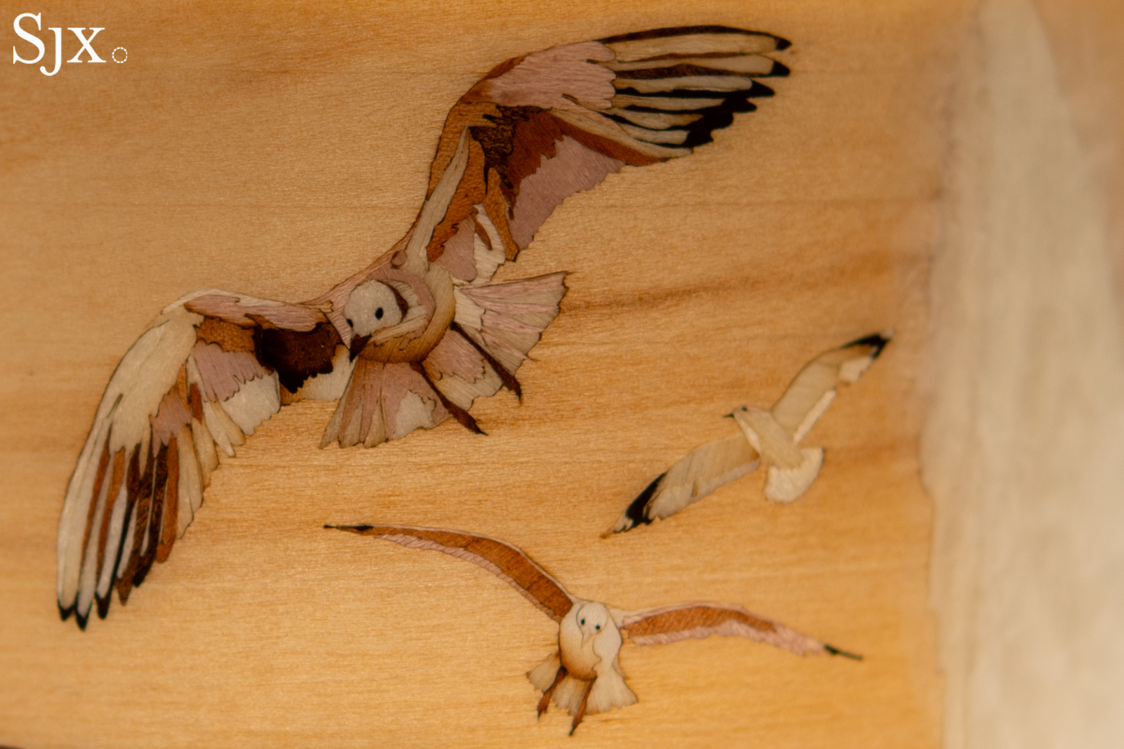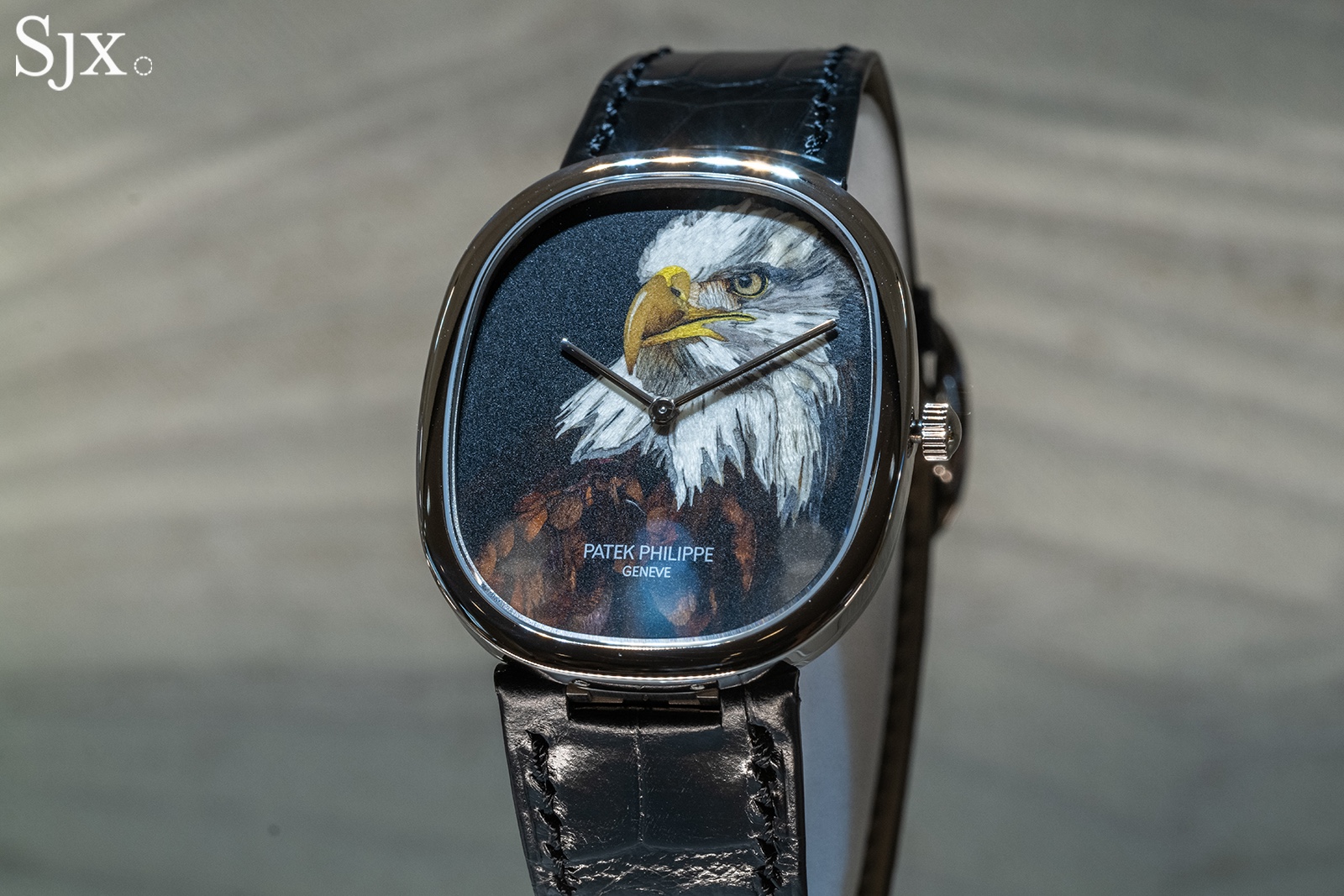 Our tour through the collection concludes with the Golden Ellipse ref. 5738/50G-029 “Bald Eagle”, which features a spectacular rendering of a fearsome bald eagle in wood marquetry. The detail is spectacular, rendered with 33 species of wood and 148 individual veneer pieces. Perhaps it’s the American in me, or because I live in a region where I see these magnificent predators quite frequently, but this is one of the pieces I’ve thought about most since leaving the exhibition.