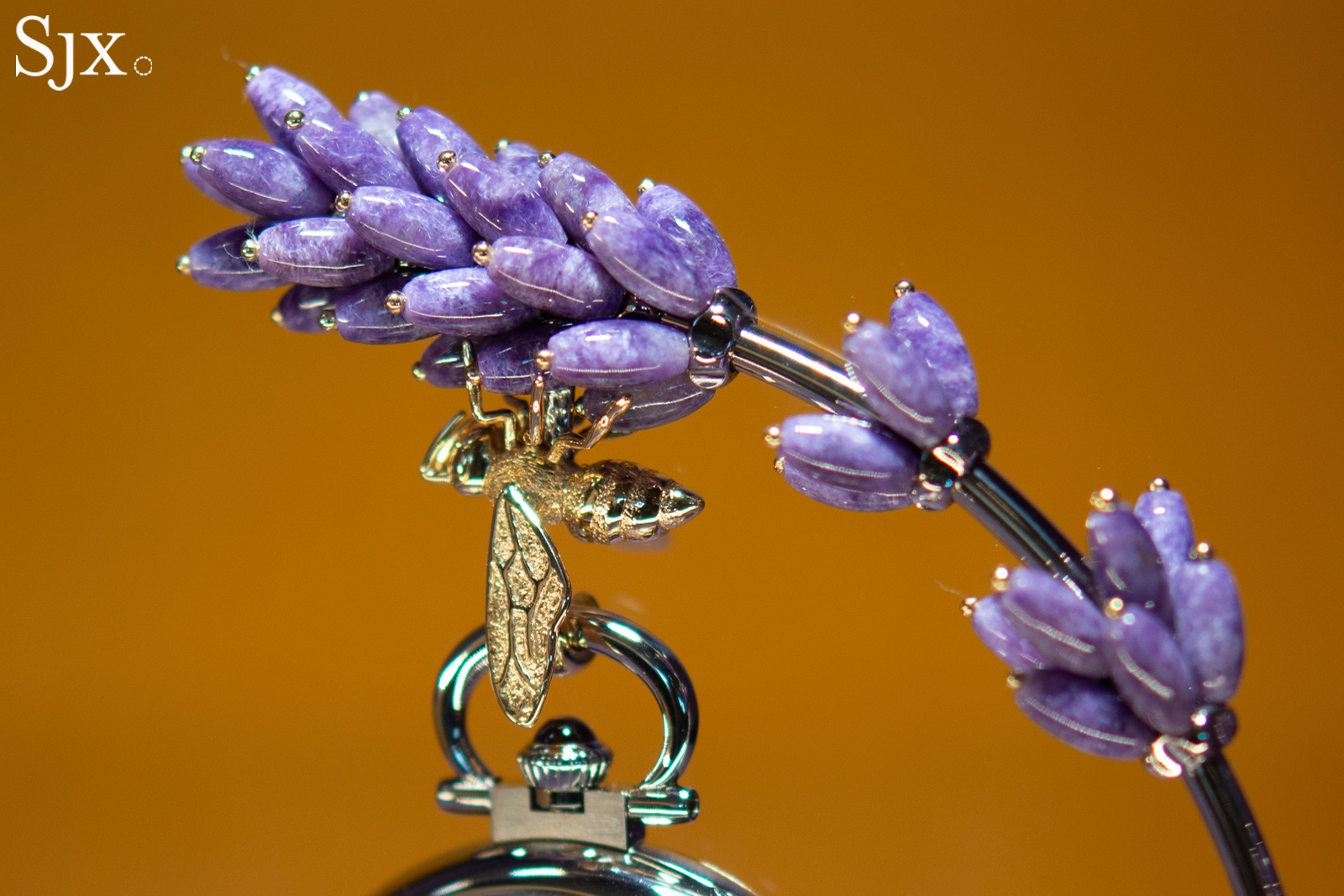 The case back is similarly decorated, with the addition of honeybees in cloisonné enamel. But the real treasure of this watch is its stand, which contains more levender whorls and an 18k gold hook hand engraved in the form of another honeybee.