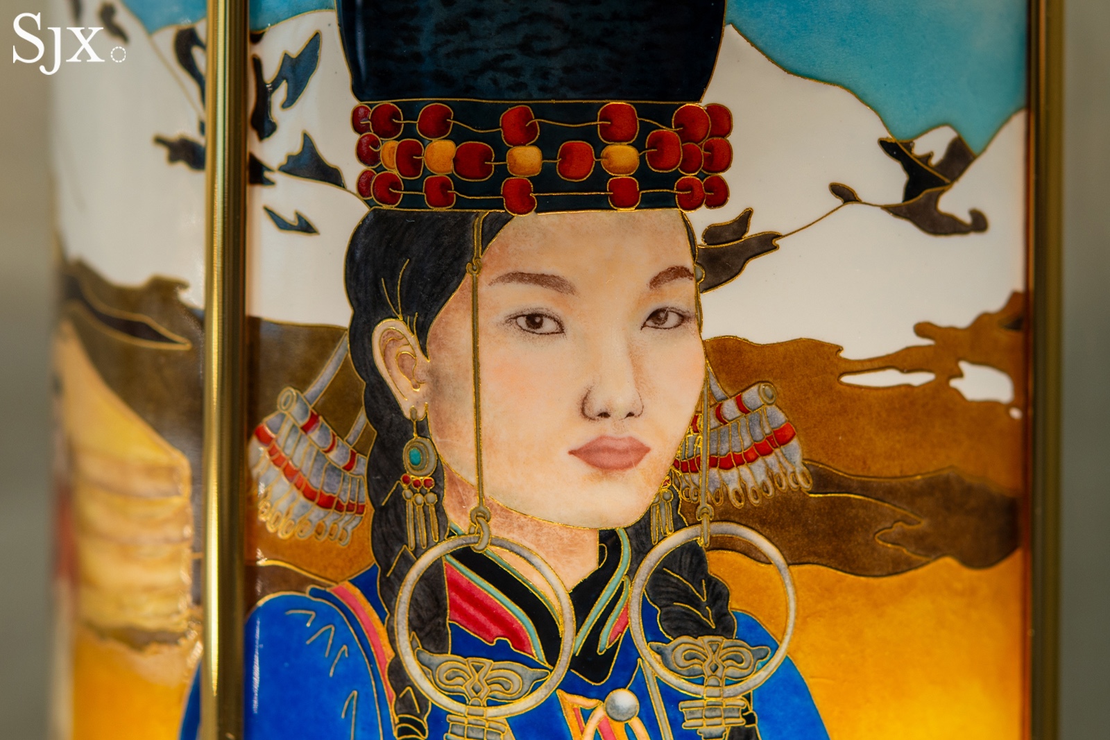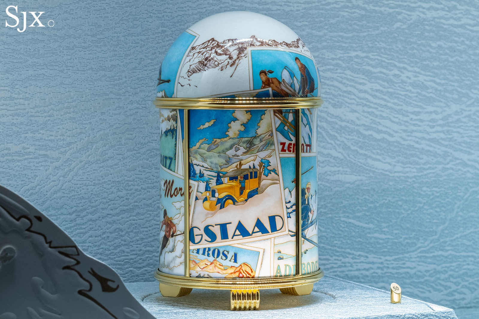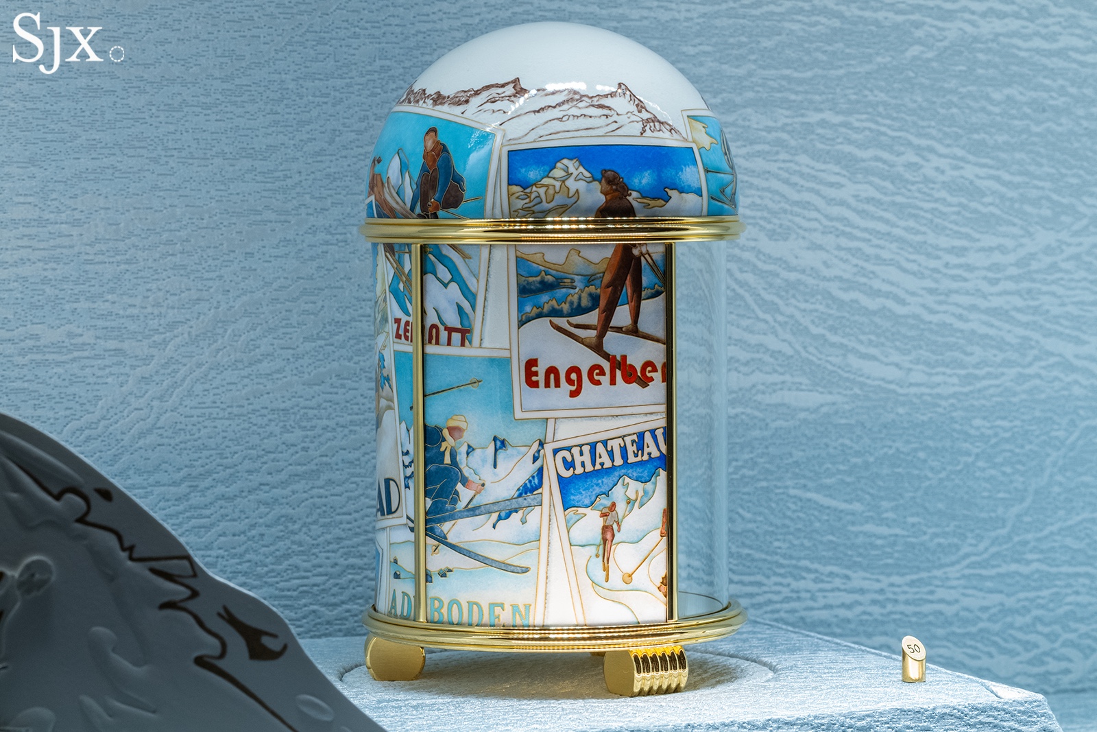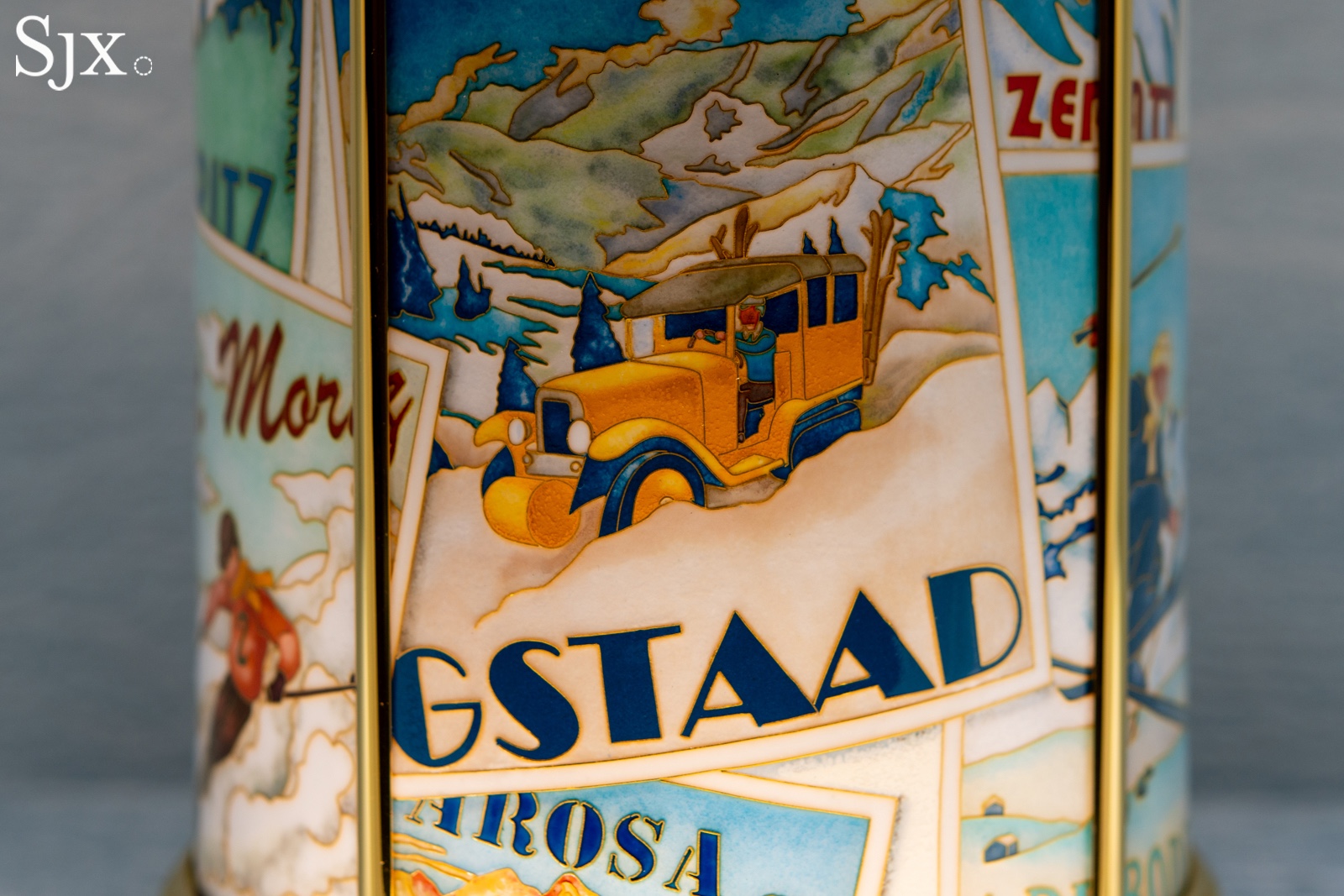 Next up is the Dome Clock ref. 20191M-001 “Skiing in Days Gone By”, which is made using similar cloisonné enamel techniques but depicts a variety of vintage travel posters of posh Swiss skiing destinations like Gstaad, Zermatt, and St. Moritz. Notably, the centre of the dial is made of leather, in an homage to the leather ski bindings of times past.