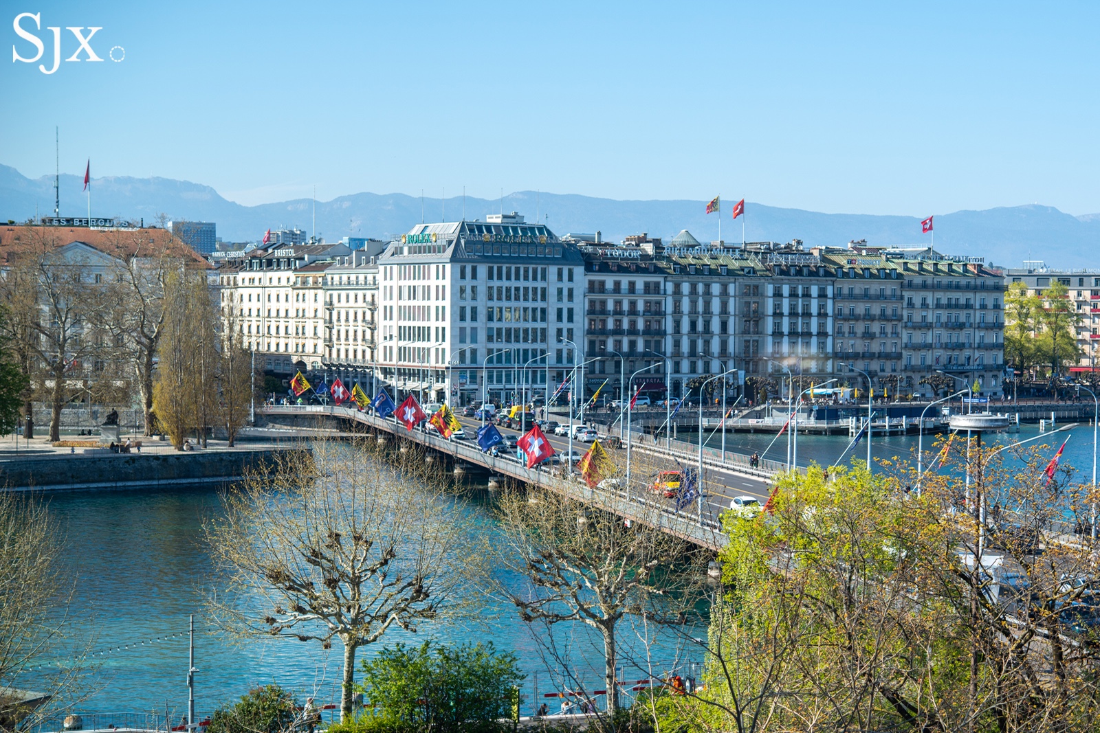 The view from the salon with the historic Four Seasons Hotel des Bergues on the left hidden by trees