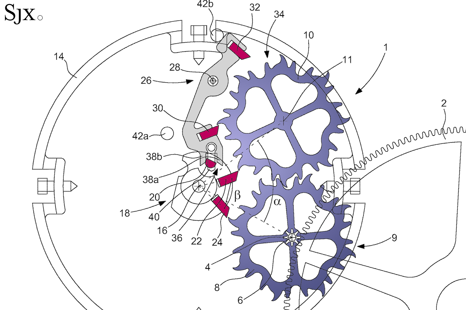 Similar to the Rolex Dynapulse or Ulysse Nardin Dual Ulysse escapement, the two escape wheels are geared together on a single level using specially designed toothing – while not explicitly claimed in the patent, the escape wheels will almost certainly be silicon. However, unlike the Rolex and Ulysse Nardin escapements that use an intermediate lever, this is a true natural escapement with direct impulse, as the escape wheels directly impulse the balance.
