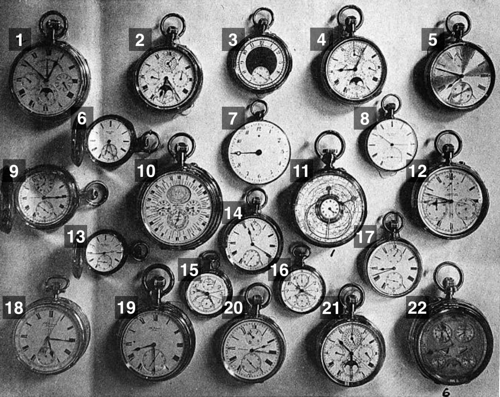 Only two watches (15 and 16) have typical Swiss-styled cases. Watches 6 and 13 can be attributed to Jules Jürgensen based on the distinctive bow. All watches shown are modern, or were at the time; the sole exception being a Breguet Souscription (7), which was already an antique a hundred years ago.