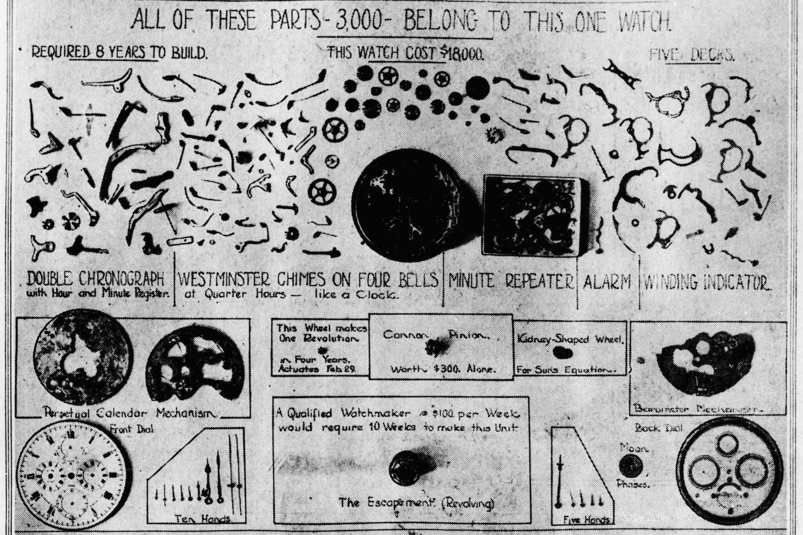 Dent super-complication parts spread. Image – Boston Evening Transcript. March 15, 1924