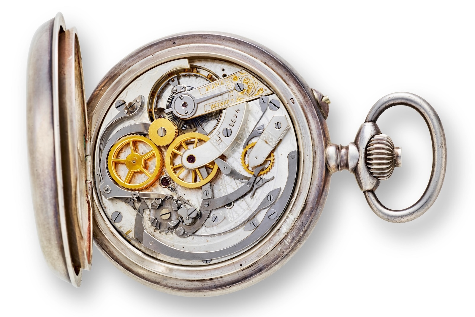 Three barrels power the movement and striking mechanism, all wound from the crown with the aid of a rocker mechanism also seen on other three-train movements by Louis Elysee Piguet. On the front is a split-second chronograph with stacked minutes and hours registers at three o’clock, while this may not seem significant now, chronographs with hours totalisers were extremely rare at the time.